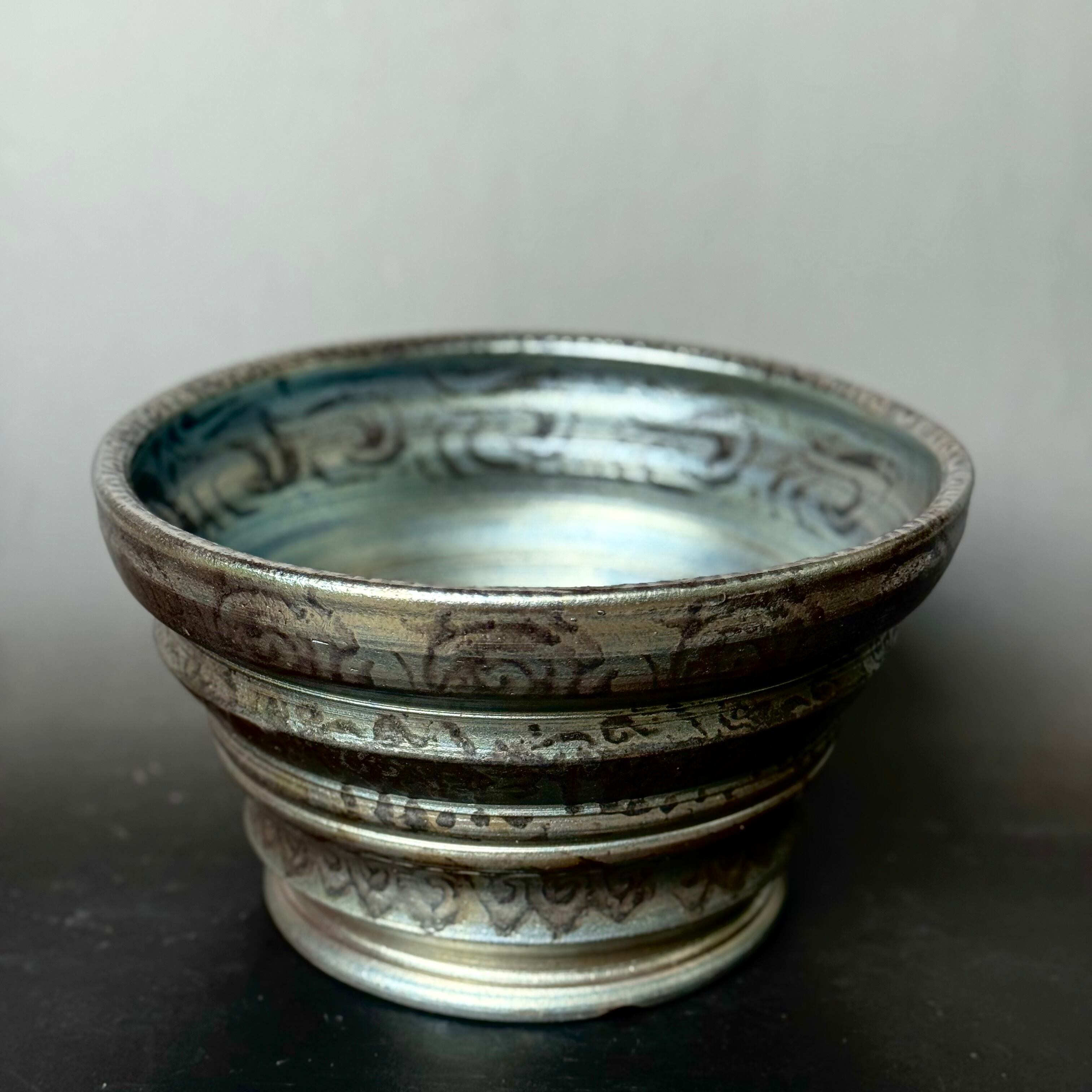 ラスター系の金属光沢で、窯野の中の置く位置で
