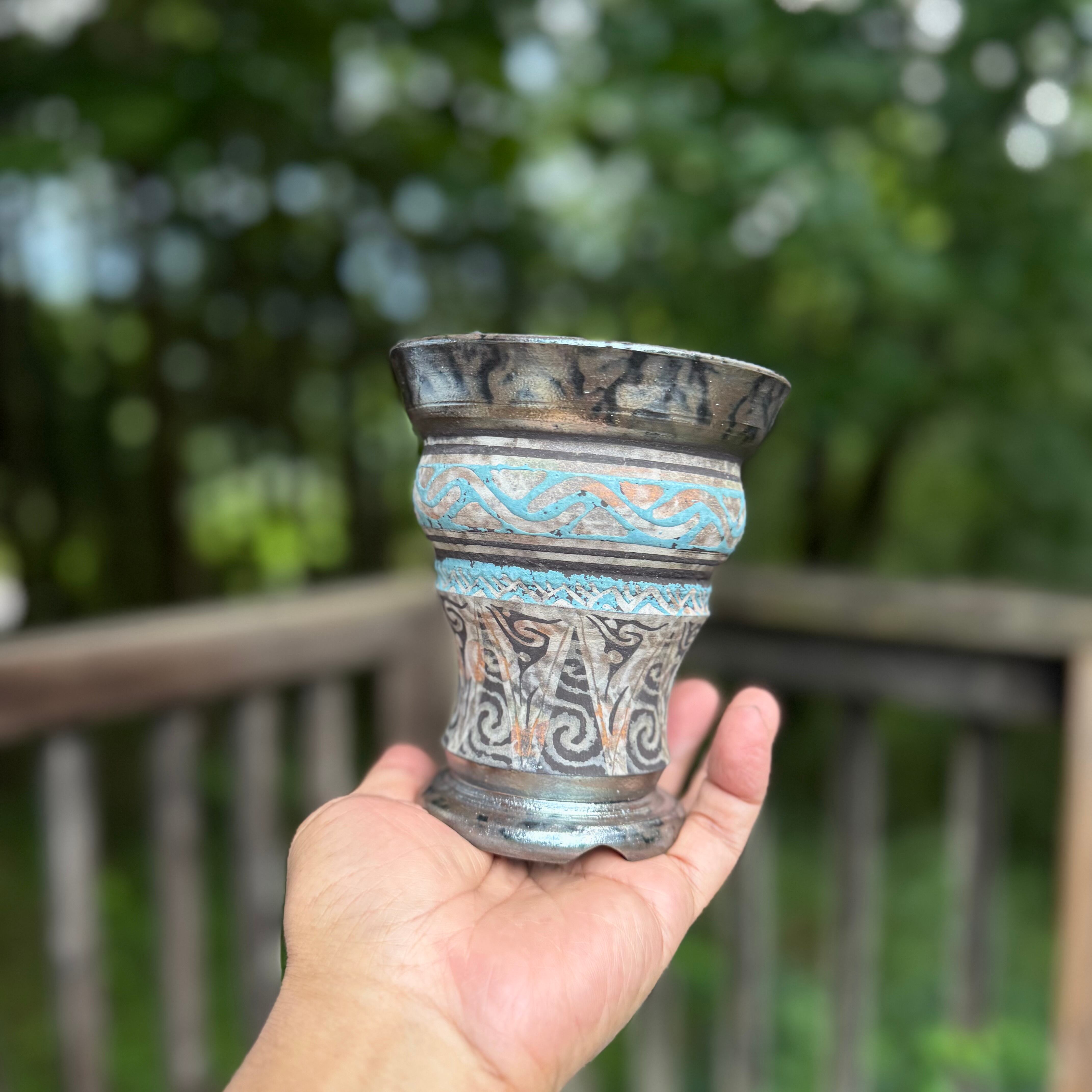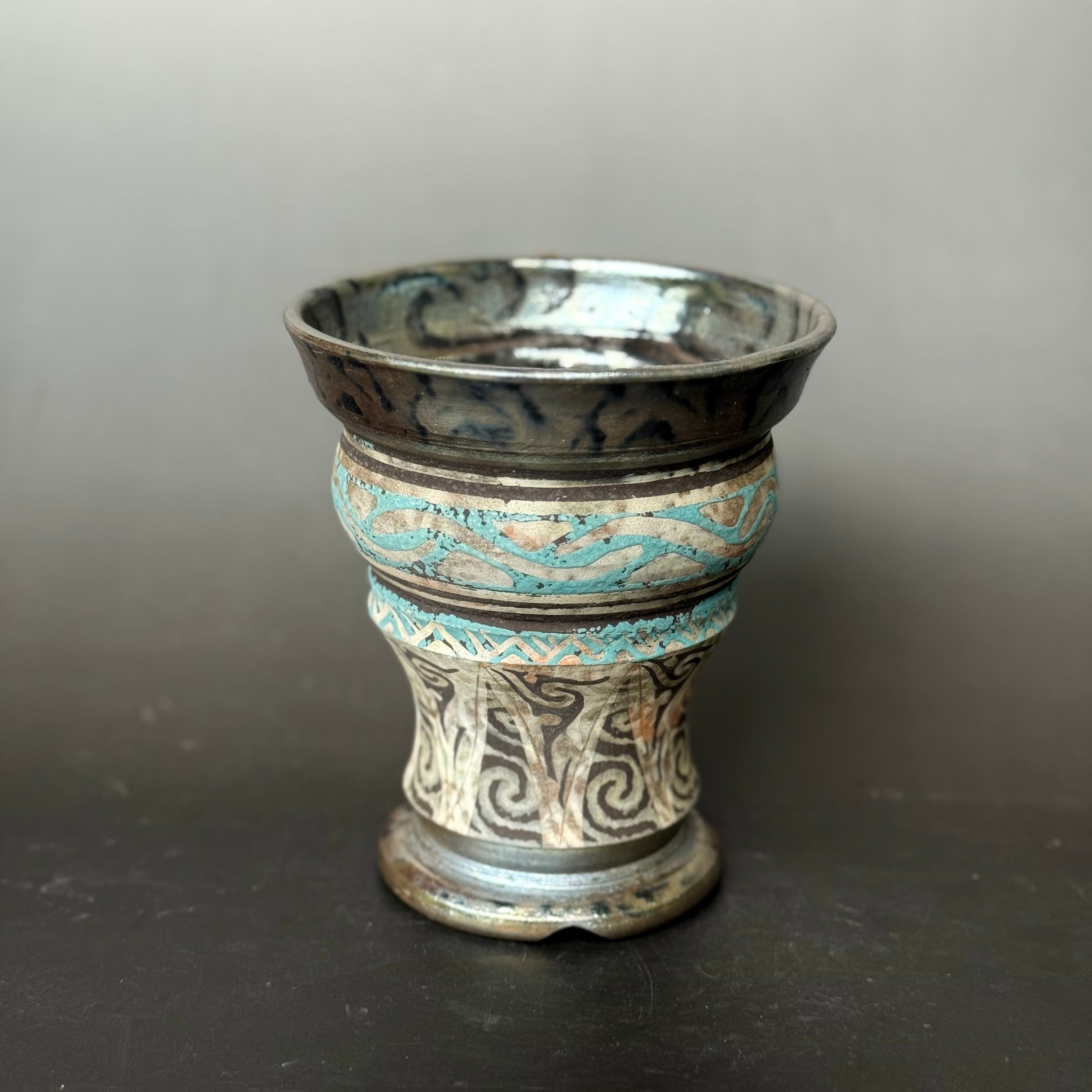 color slipによる彩色は、薪による炭彩が加わり派手でありながら渋い発色の仕上がりとなっています。古代の遺跡から発掘された彩色土器の様な風合いを帯びるよう志向して彩色したものです。