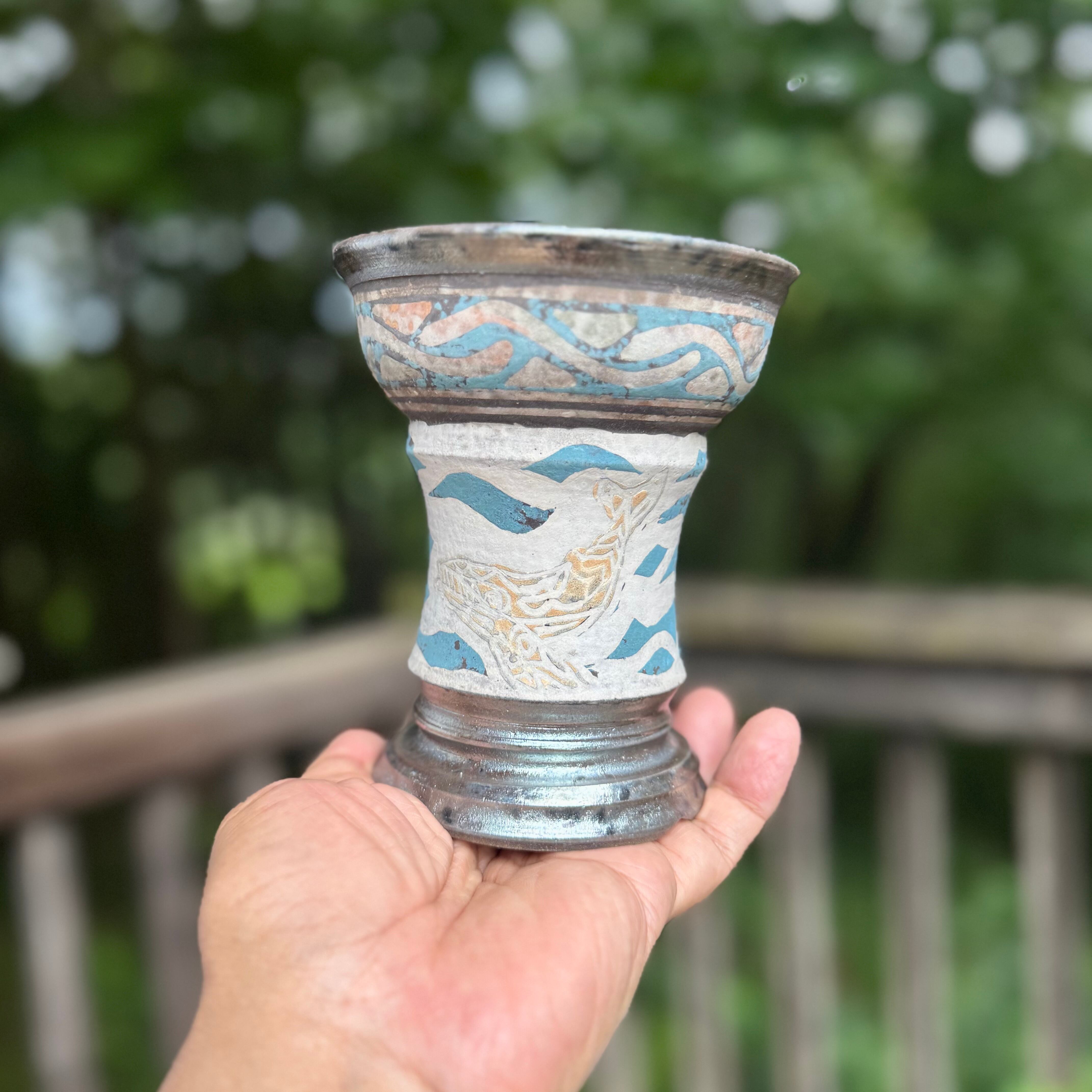 color slipによる彩色は、薪による炭彩が加わり派手でありながら渋さのある遺跡から発掘された彩色土器の風合いを帯びるよう願っています。