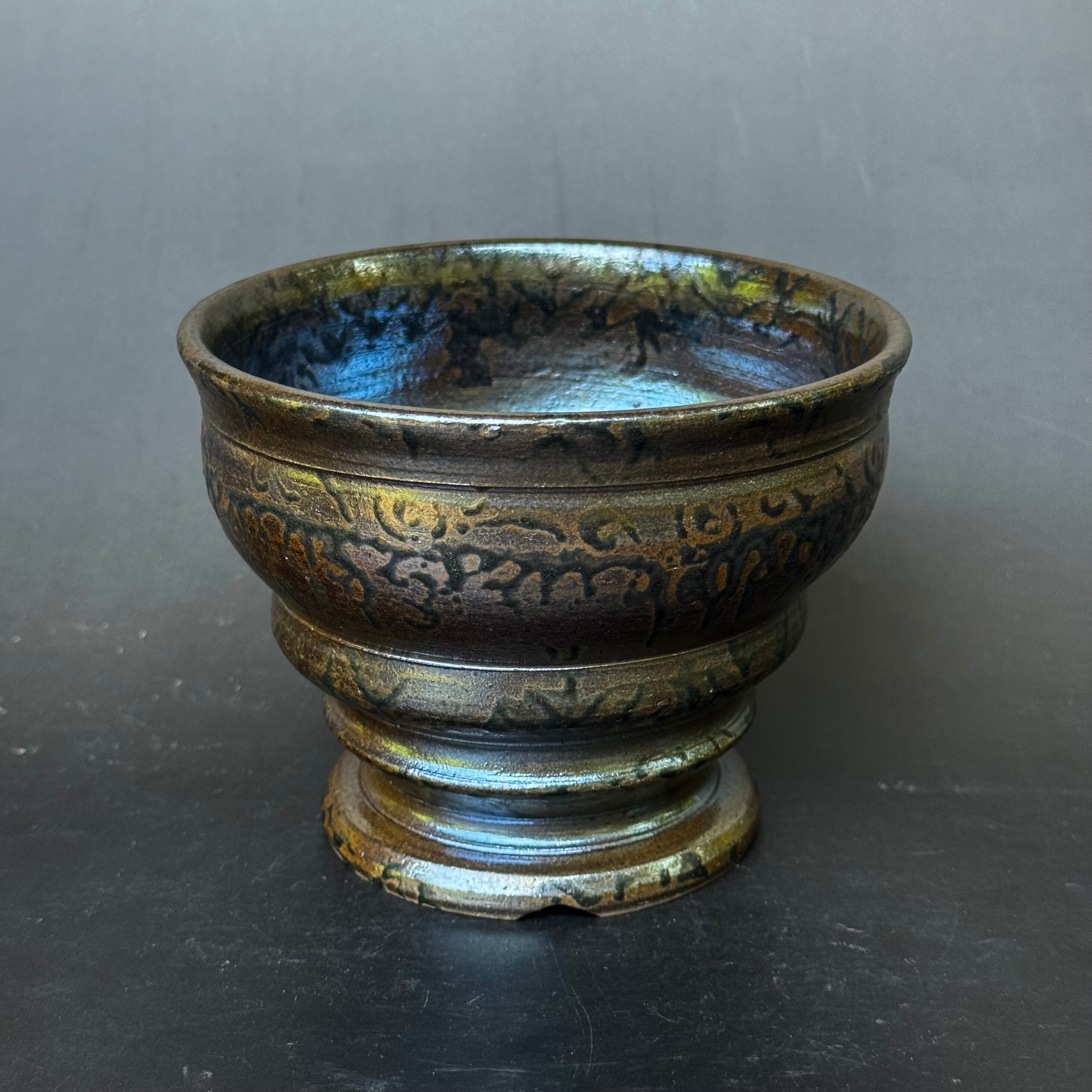 ラスター系の金属光沢で、窯野の中の置く位置で