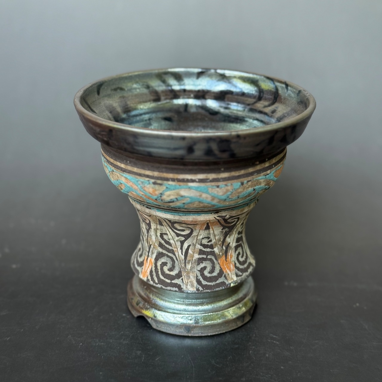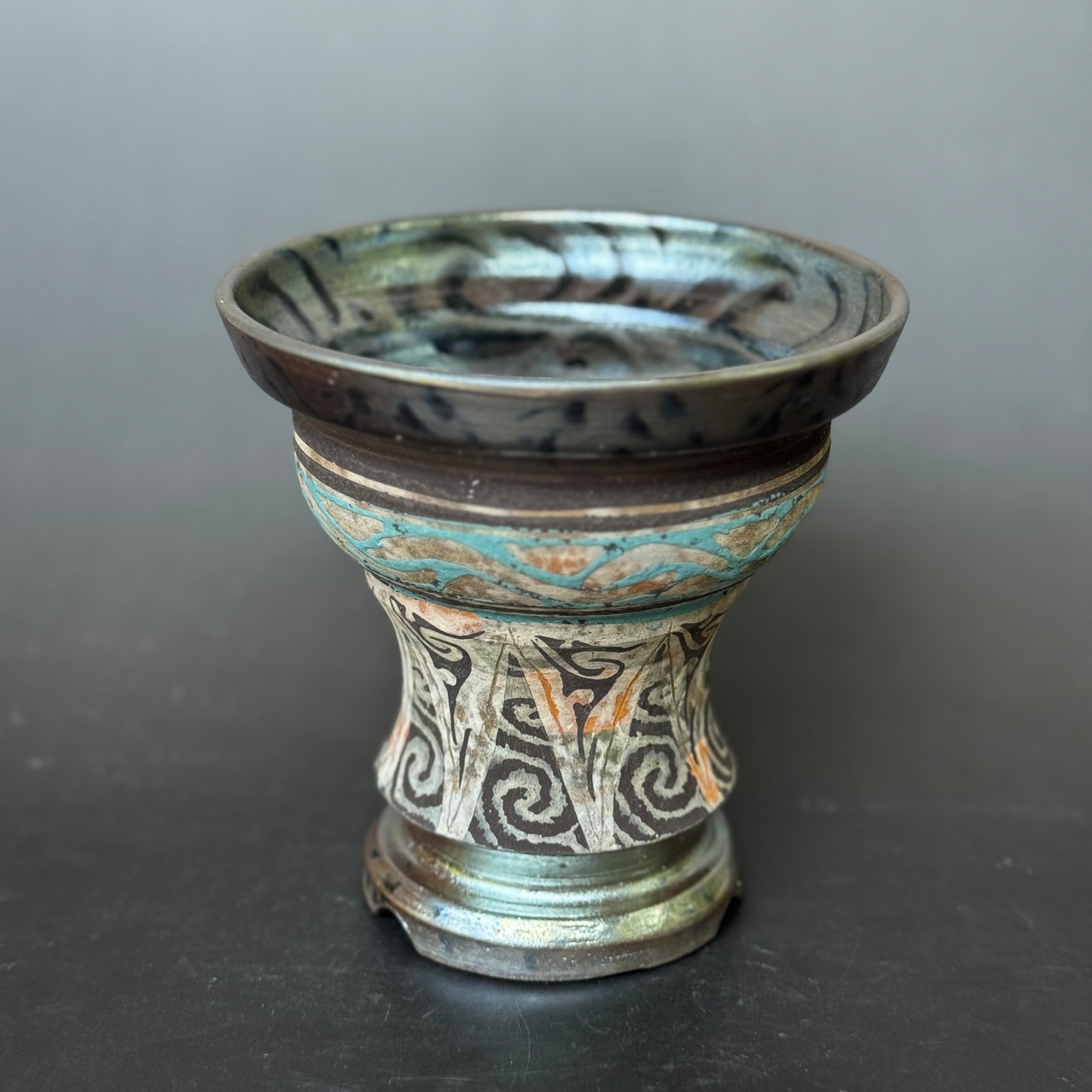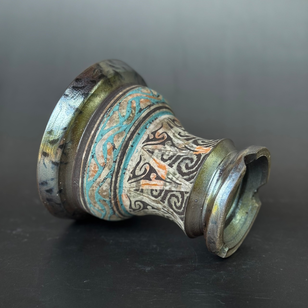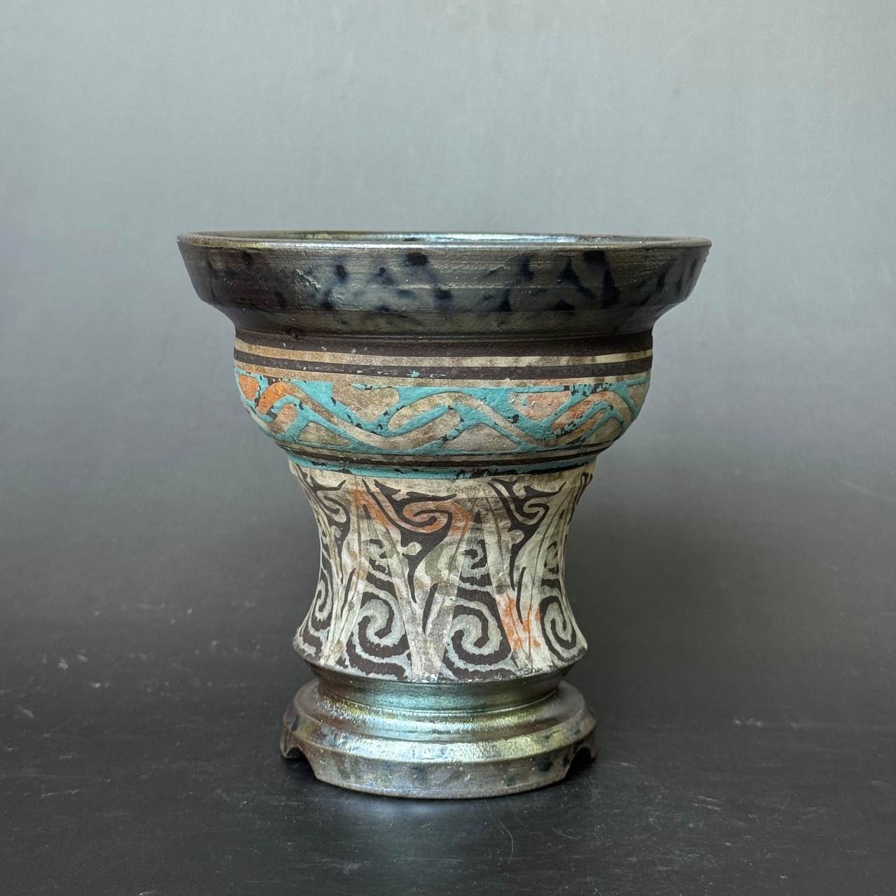 color slipによる彩色は、薪による炭彩が加わり派手でありながら渋い発色の仕上がりとなっています。古代の遺跡から発掘された彩色土器の様な風合いを帯びるよう志向して彩色したものです。