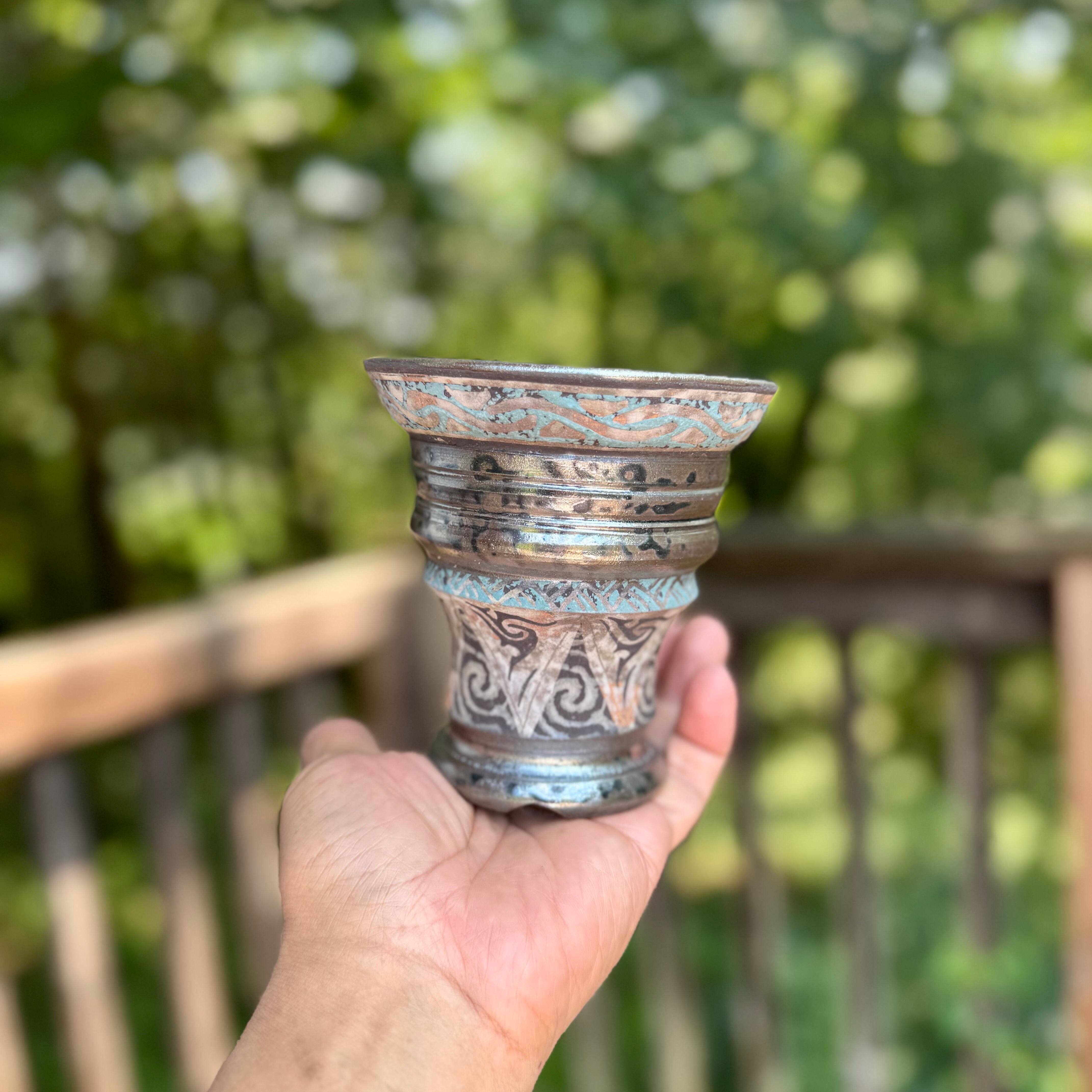 color slipによる彩色は、薪による炭彩が加わり派手でありながら渋い発色の仕上がりとなっています。古代の遺跡から発掘された彩色土器の様な風合いを帯びるよう志向して彩色したものです。