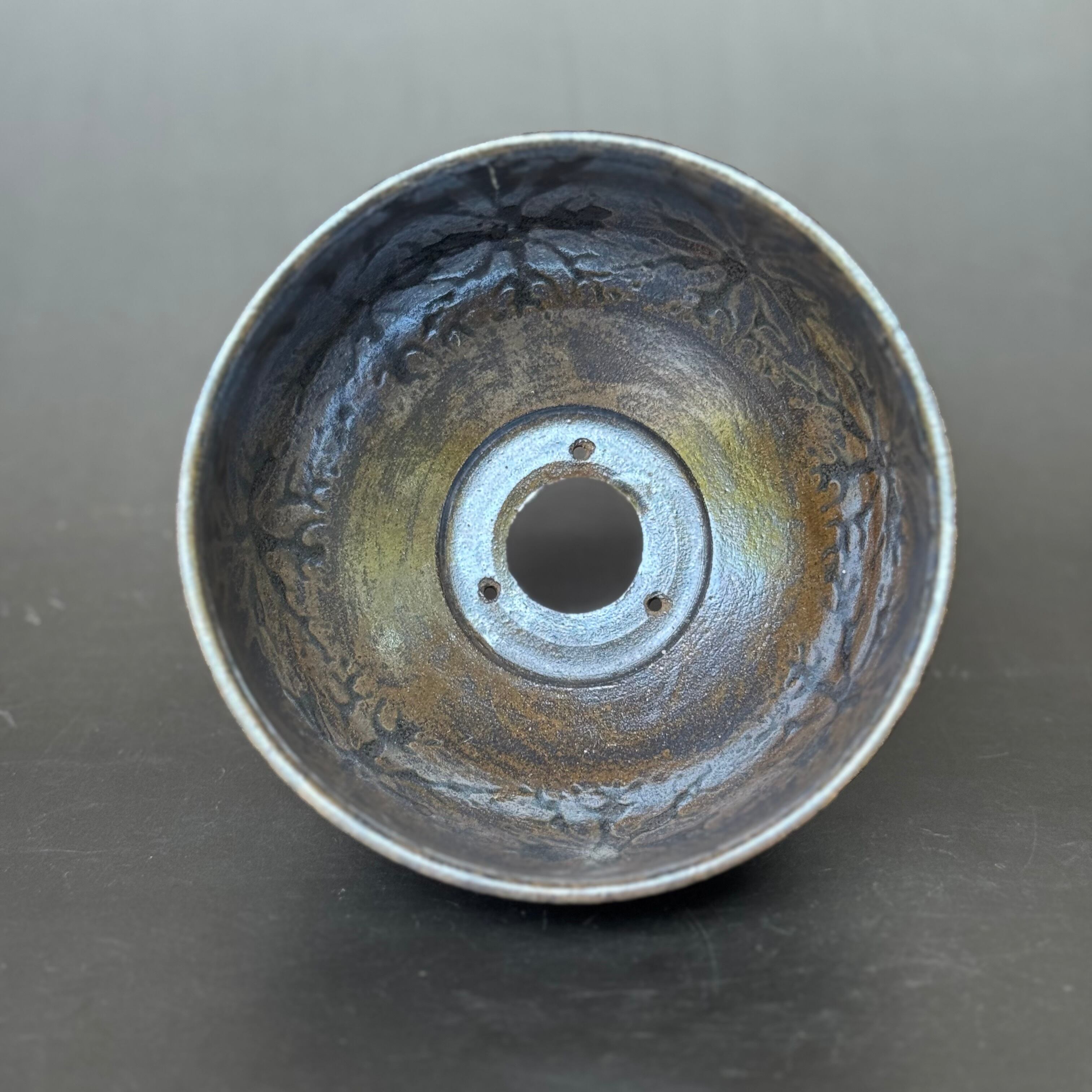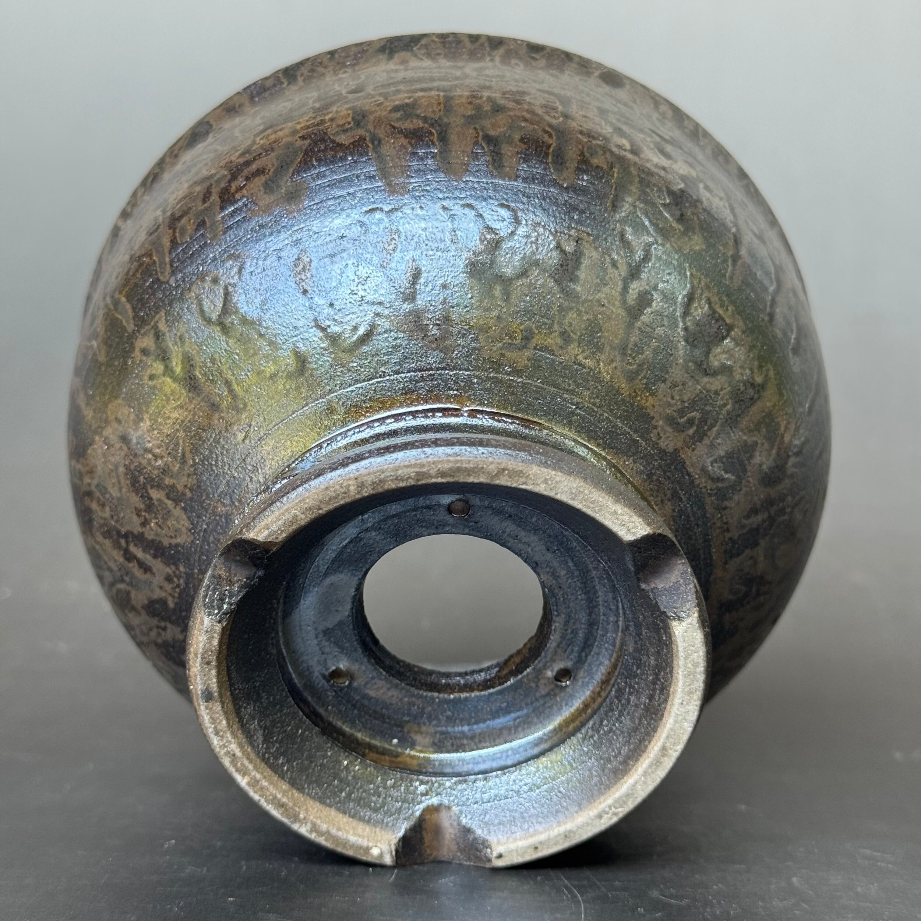 この鉢の特徴は、土が多めに入るふっくらとしたフォルムながら器底は一旦絞りソリッドに、、そこから広がる高台は、安定感があり簡単には倒れない作りです。この高台は、付け高台(後付けの高台)ではなく、削り高台(本体から削り出したもので手間は少しかかりますが、傷にならず強い作りです。)底穴は水抜けが良く、また程よい保水性があるサイズです。ワイヤー通し用の小穴も開けています。