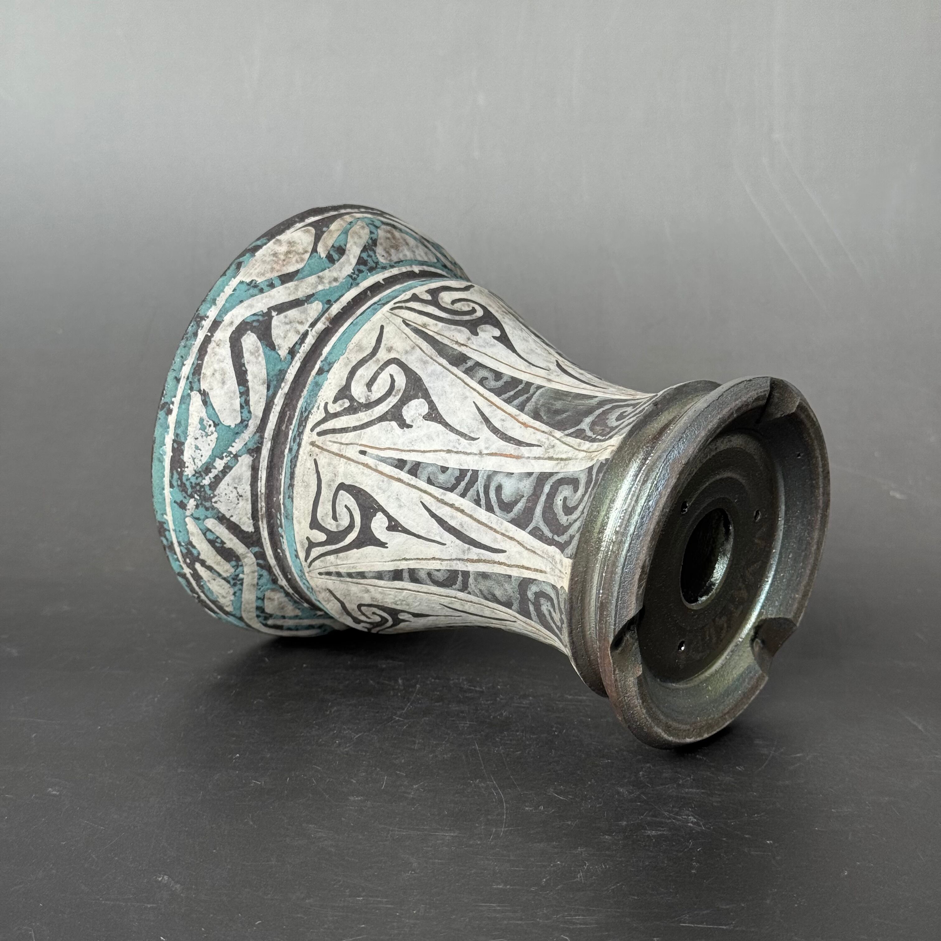 color slipによる彩色は、薪による炭彩が加わり派手でありながら渋い発色の仕上がりとなっています。古代の遺跡から発掘された彩色土器の様な風合いを帯びるよう志向して彩色したものです。