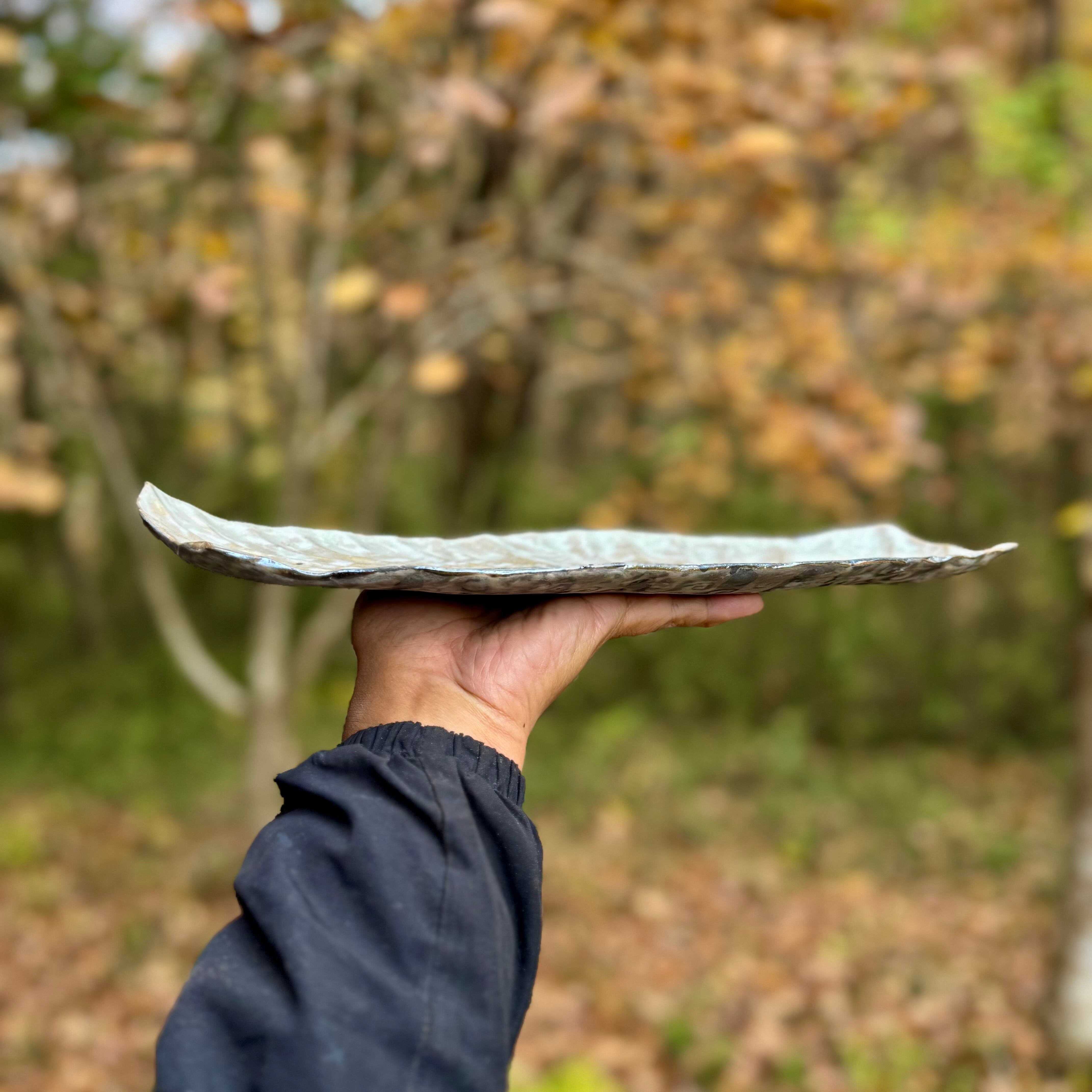 内側は、半艶のある変化のある半透明の乳濁釉薬を施し、釉薬の下に入れた模様が見えるようにしました。ところどころにある小さな黒い斑点は、陶土の鉄分により発色したものです。器に渋みを加える風景として見ていただければ幸いです。