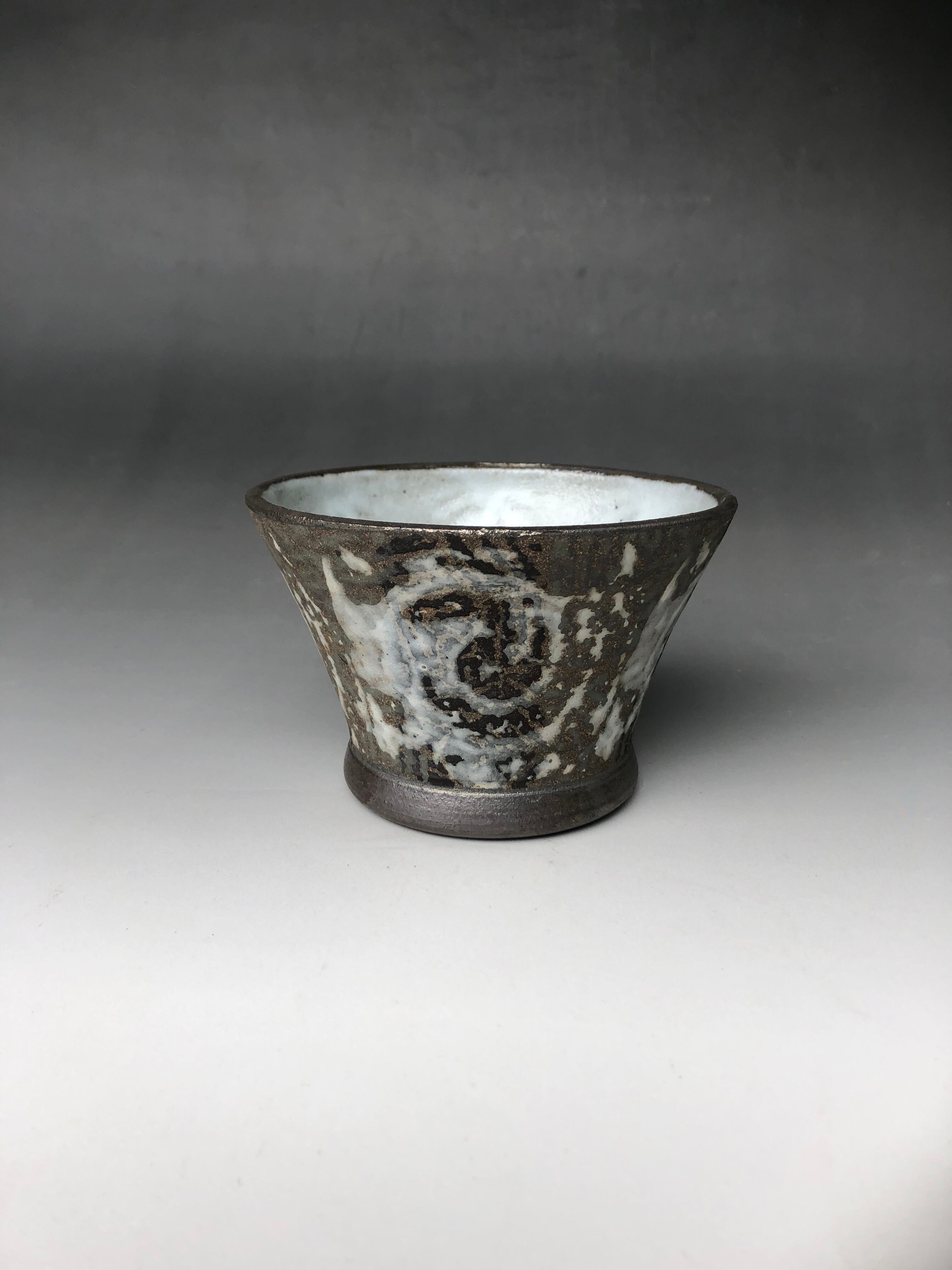 側面に渦巻く気流をデザイン化した紋様を施しました。内側は、失透系の釉薬、釉下にも模様を入れました。