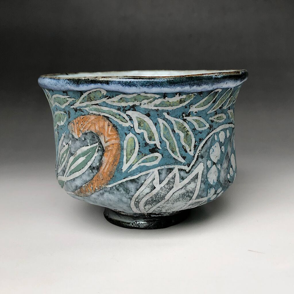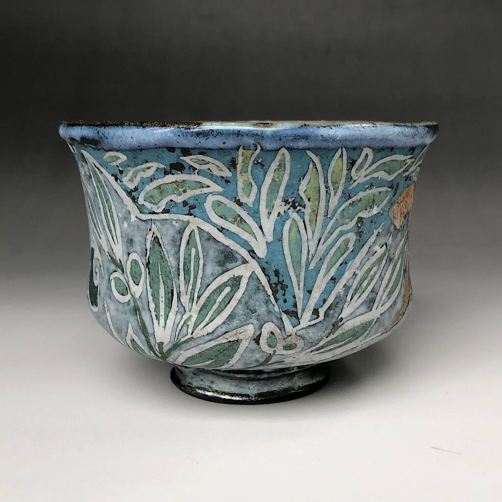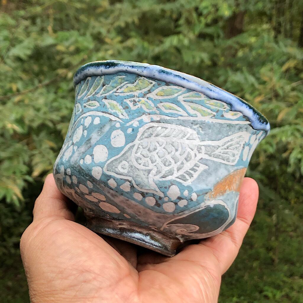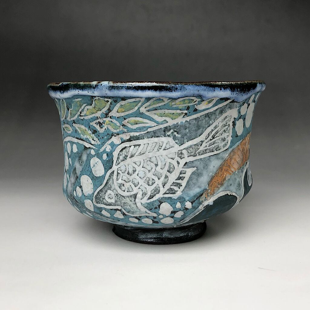 器肌には清流の中を泳ぐ魚を中心に波光などの模様を蝋結技法で描いています。