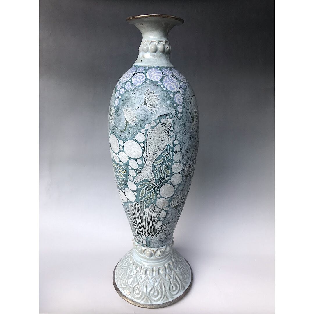 水流の中を泳ぐ魚を中心モチーフに、水中花、波光模様などを組み合わせて描いています。
