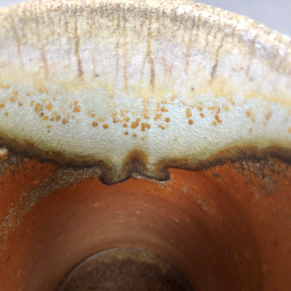 多い面は荒々しく、そして良く溶けた反対面、内部に流れ込んだ自然釉の多さ、見どころの多い作品だと思います。