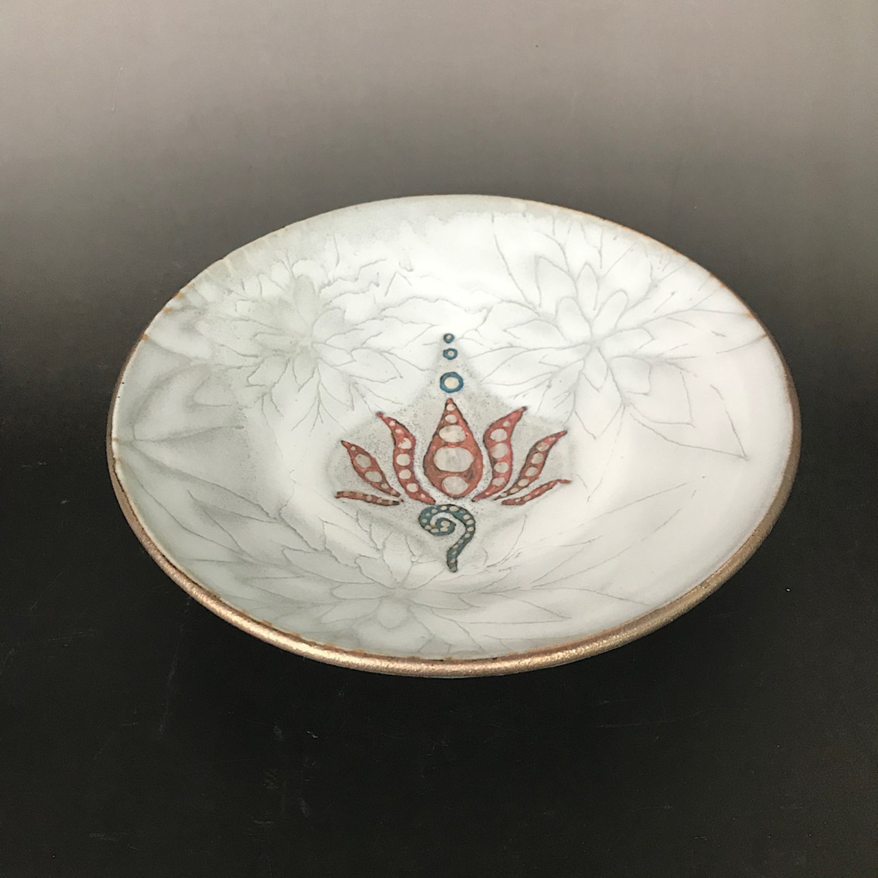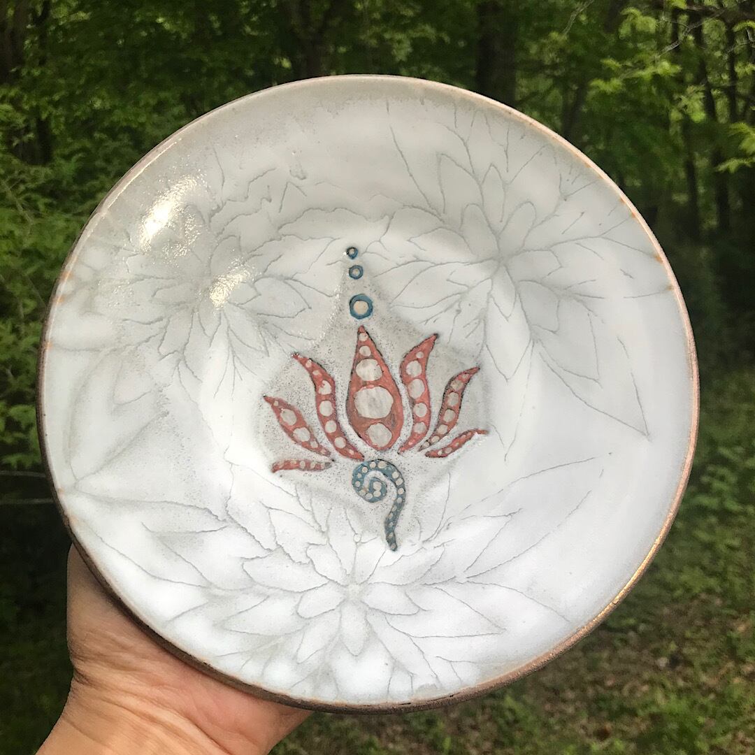 内側は、釉薬の流れで花弁模様を入れました。
