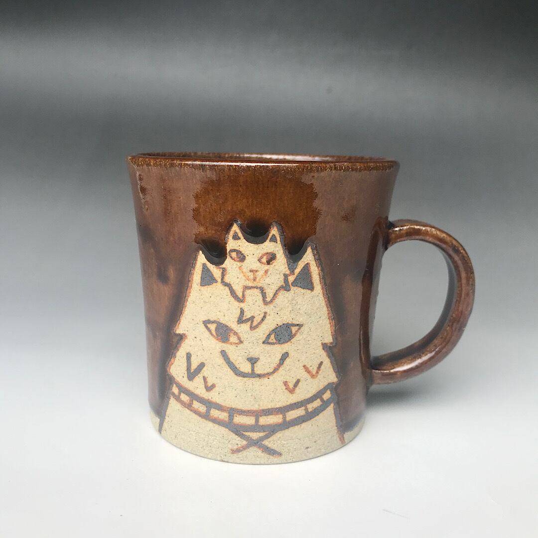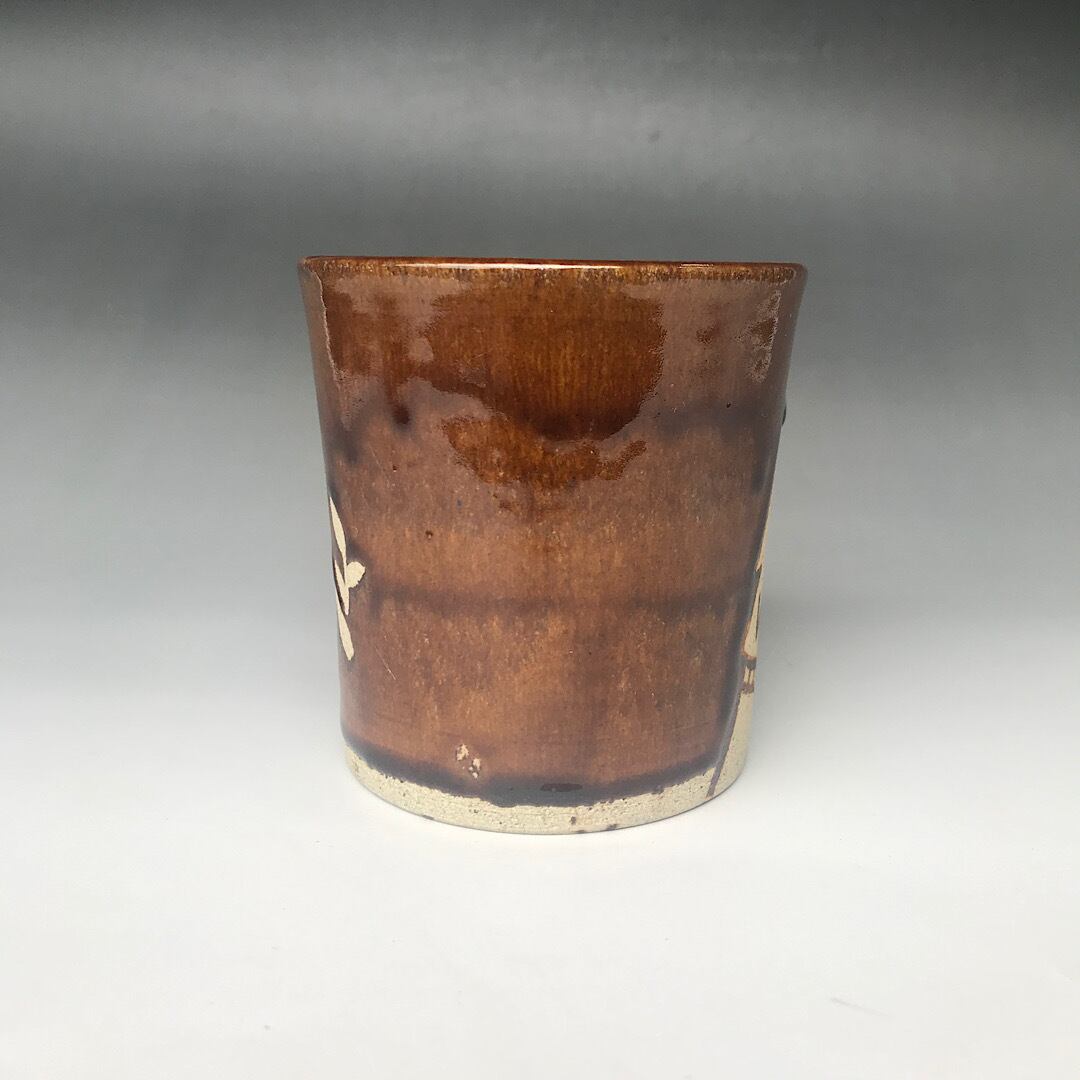 全体に、飴釉を掛け、模様部分は、焼締めにしています。飴釉は、伝統的な釉薬で、一見地味ですが、光りのもとで見ると複雑な発色の景色が見られます。様々な色が混ざり合っているのがわかります。あきの来ない、どこか、ほっと気持ちがおちつく様な色合いです。