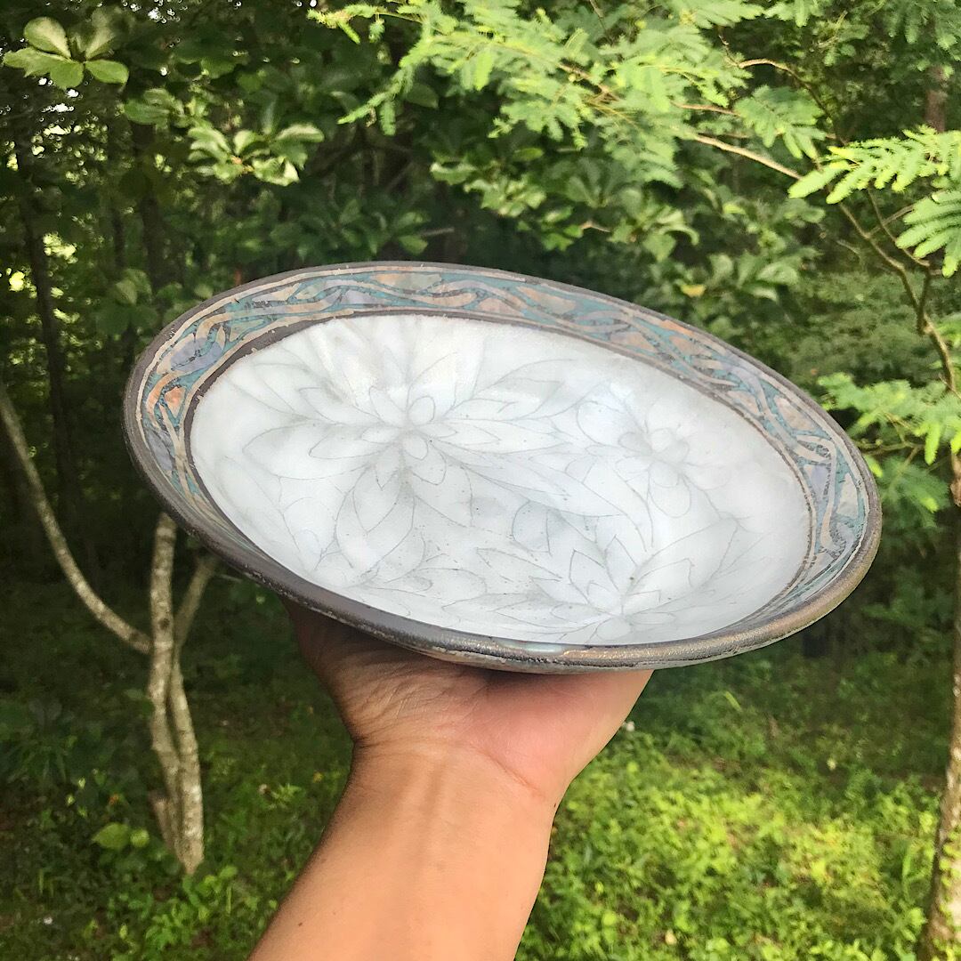 内側は、釉薬の流れで花弁模様を入れました。
