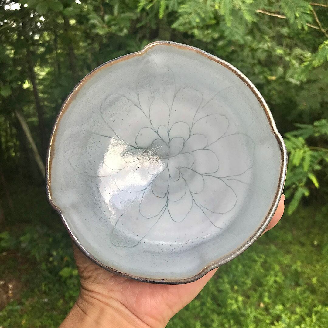 外面は、シンプルなストライプ文様をロウ抜き技法で描いて、ブルーグレイの発色で仕上がっています。