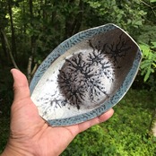 窯焚きの最後に薪で強還元をかけて内側は、渋い銀黒色の仕上がりになっています。野菜のグリーン、トマトの赤等が映え美味しく見えると思います。