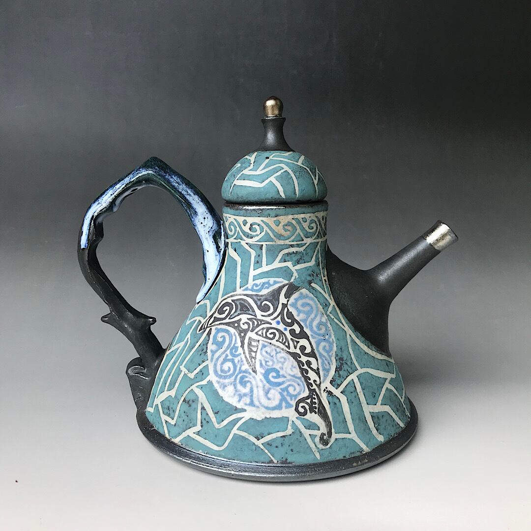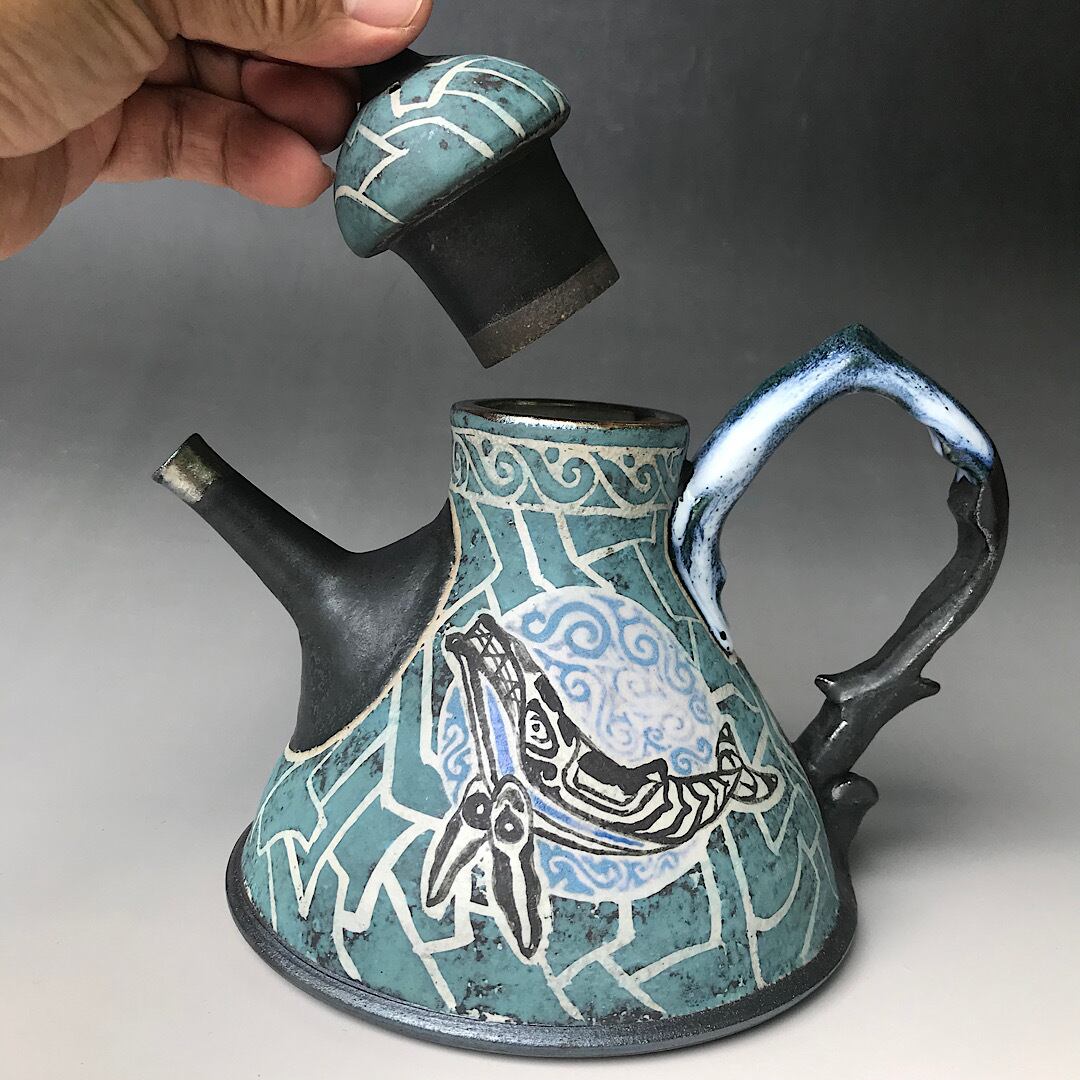 海流の中のイルカとクジラをデザイン化した模様を器肌の外側に手描きしています。