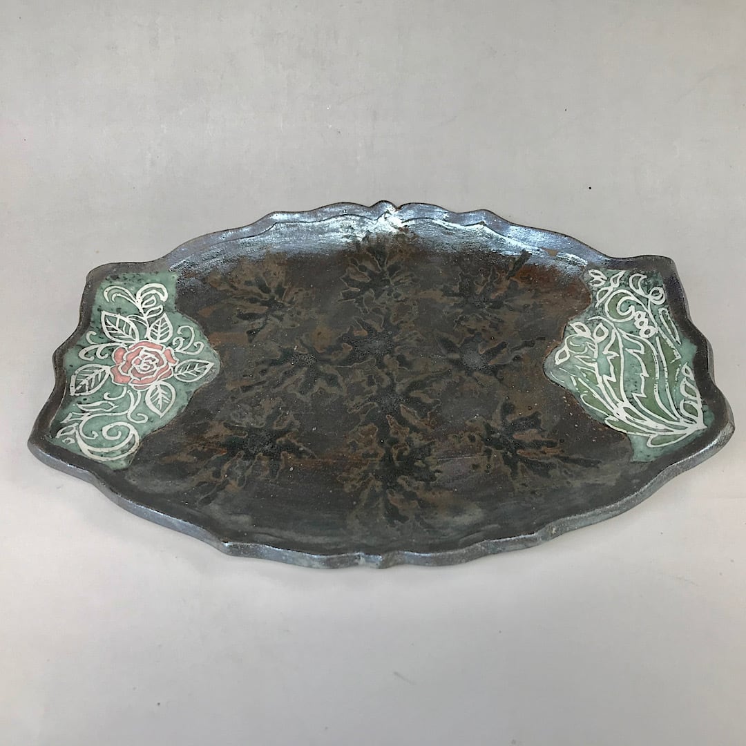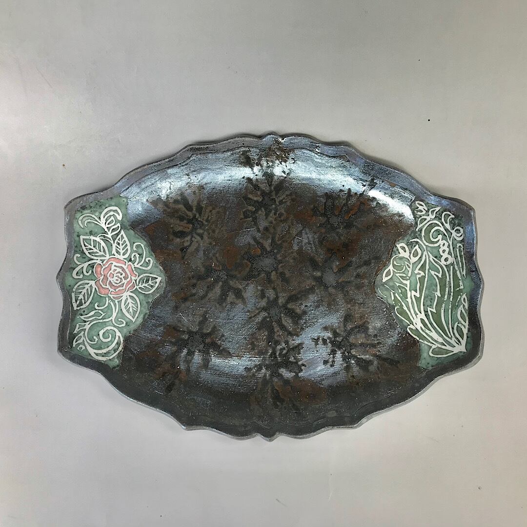 植物の葉と薔薇をデザインした模様を器肌の縁に蝋抜き技法で手描きしています。