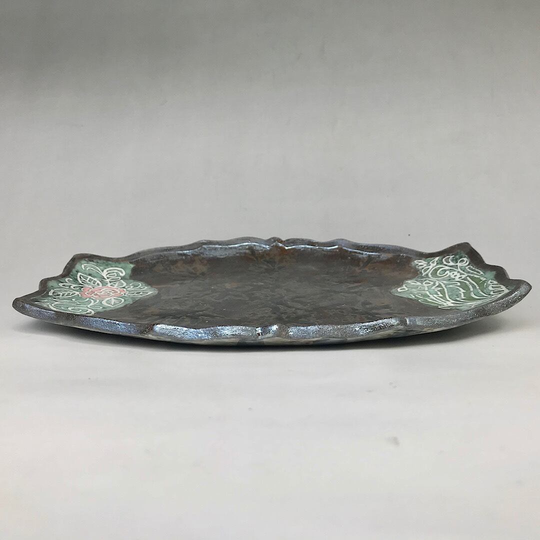 内側の釉薬は、薪による強還元で得られる燻し銀黒で野菜のグリーンやトマトの赤が映え美味しく見えると思います。
