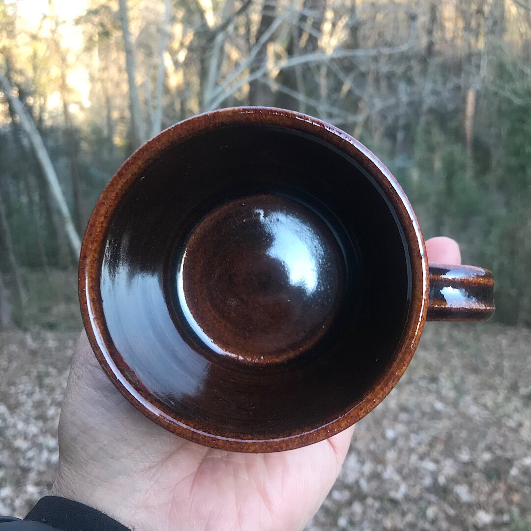 全体に、飴釉を掛け、模様部分は、焼締めにしています。飴釉は、伝統的な釉薬で、一見地味ですが、光りのもとで見ると複雑な発色の景色が見られます。様々な色が混ざり合っているのがわかります。あきの来ない、どこか、ほっと気持ちがおちつく様な色合いです。