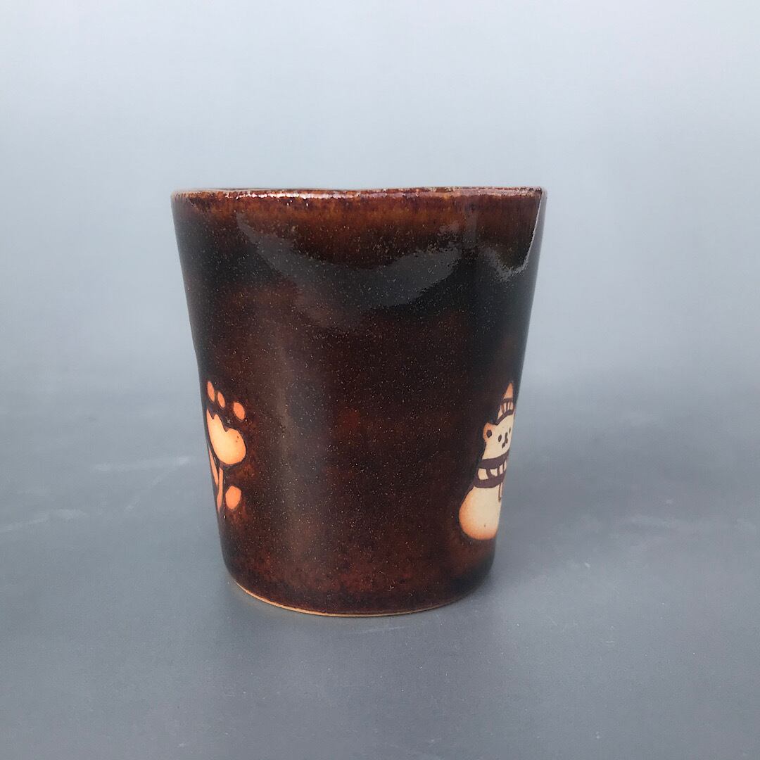 全体に、飴釉を掛け、模様部分は、焼締めにしています。飴釉は、伝統的な釉薬で、一見地味ですが、光りのもとで見ると複雑な発色の景色が見られます。様々な色が混ざり合っているのがわかります。あきの来ない、どこか、ほっと気持ちがおちつく様な色合いです。