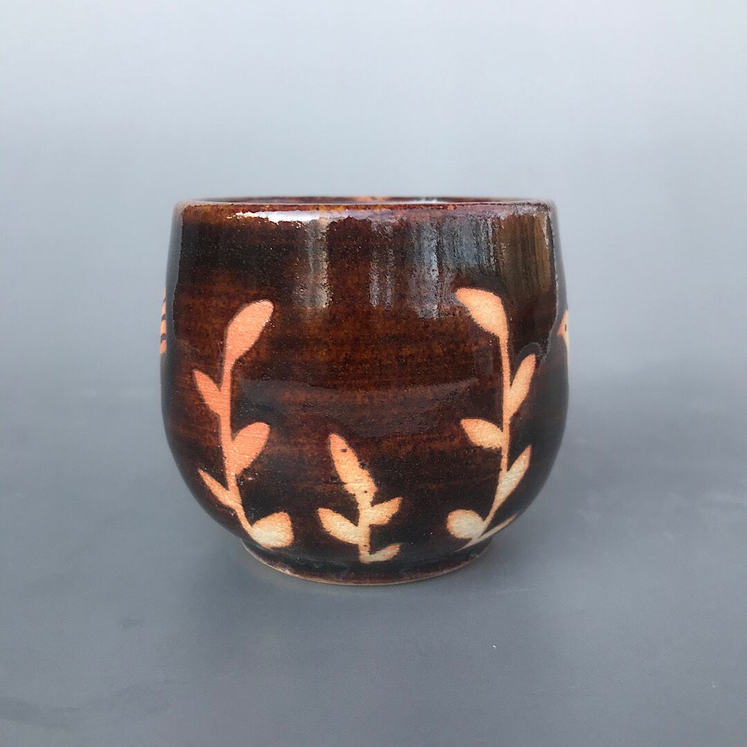 全体に、飴釉を掛け、模様部分は、焼締めにしています。飴釉は、伝統的な釉薬で、一見地味ですが、光りのもとで見ると複雑な発色の景色が見られます。様々な色が混ざり合っているのがわかります。あきの来ない、どこか、ほっと気持ちがおちつく様な色合いです。