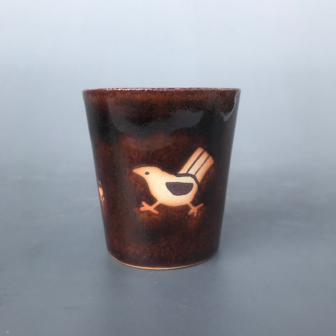 全体に、飴釉を掛け、模様部分は、焼締めにしています。飴釉は、伝統的な釉薬で、一見地味ですが、光りのもとで見ると複雑な発色の景色が見られます。様々な色が混ざり合っているのがわかります。あきの来ない、どこか、ほっと気持ちがおちつく様な色合いです。