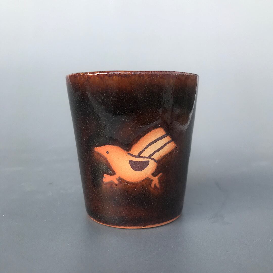 全体に、飴釉を掛け、模様部分は、焼締めにしています。飴釉は、伝統的な釉薬で、一見地味ですが、光りのもとで見ると複雑な発色の景色が見られます。様々な色が混ざり合っているのがわかります。あきの来ない、どこか、ほっと気持ちがおちつく様な色合いです。