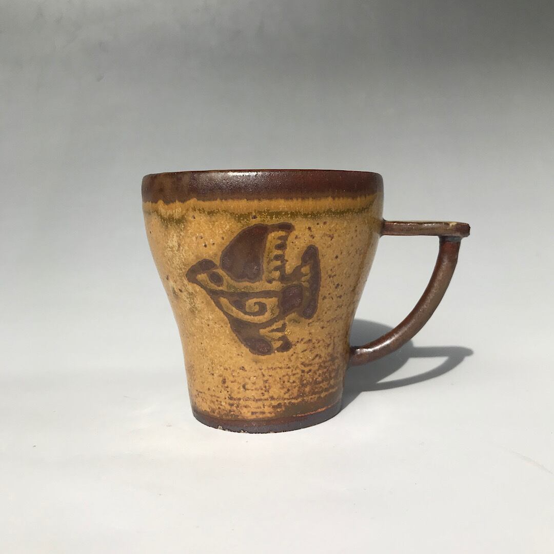 全体に、黄瀬戸釉薬を掛け、模様部分は、釉下に描いています。黄瀬戸は、伝統的な釉薬で、一見地味ですが、複雑で変化のある柔らかい発色が見られます。あきの来ない、気持ちがおちつく色合いです。