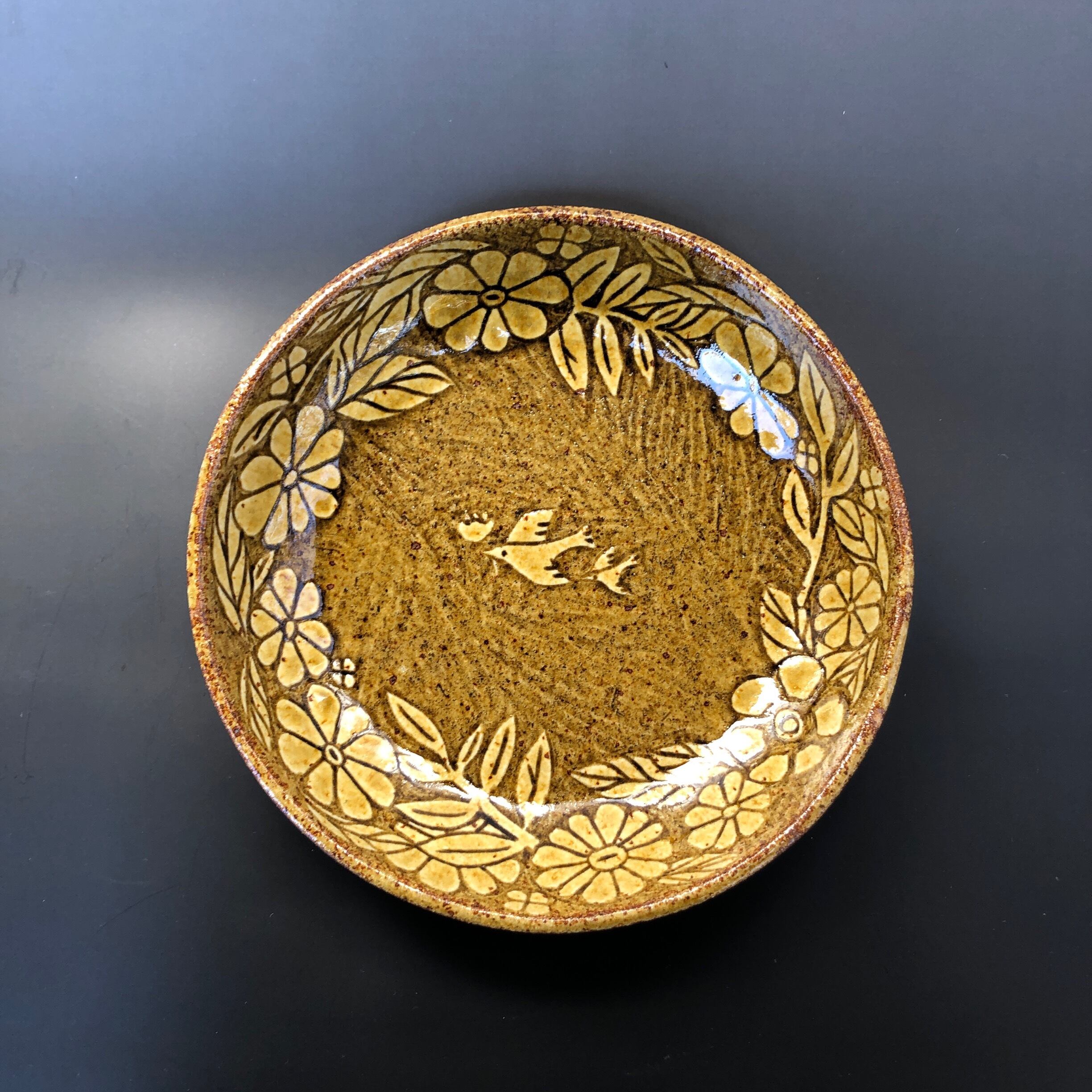 鳥の親子と花模様のカービング皿