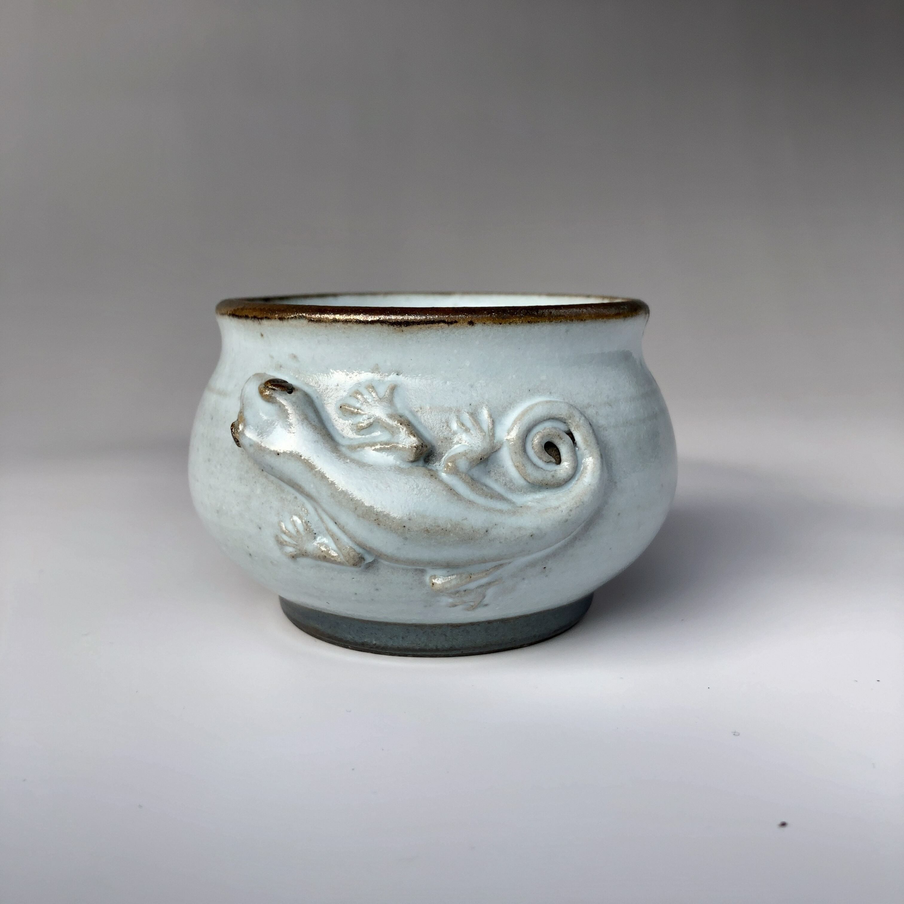 カップの側面に小さな尾を巻いたヤモリがいます。