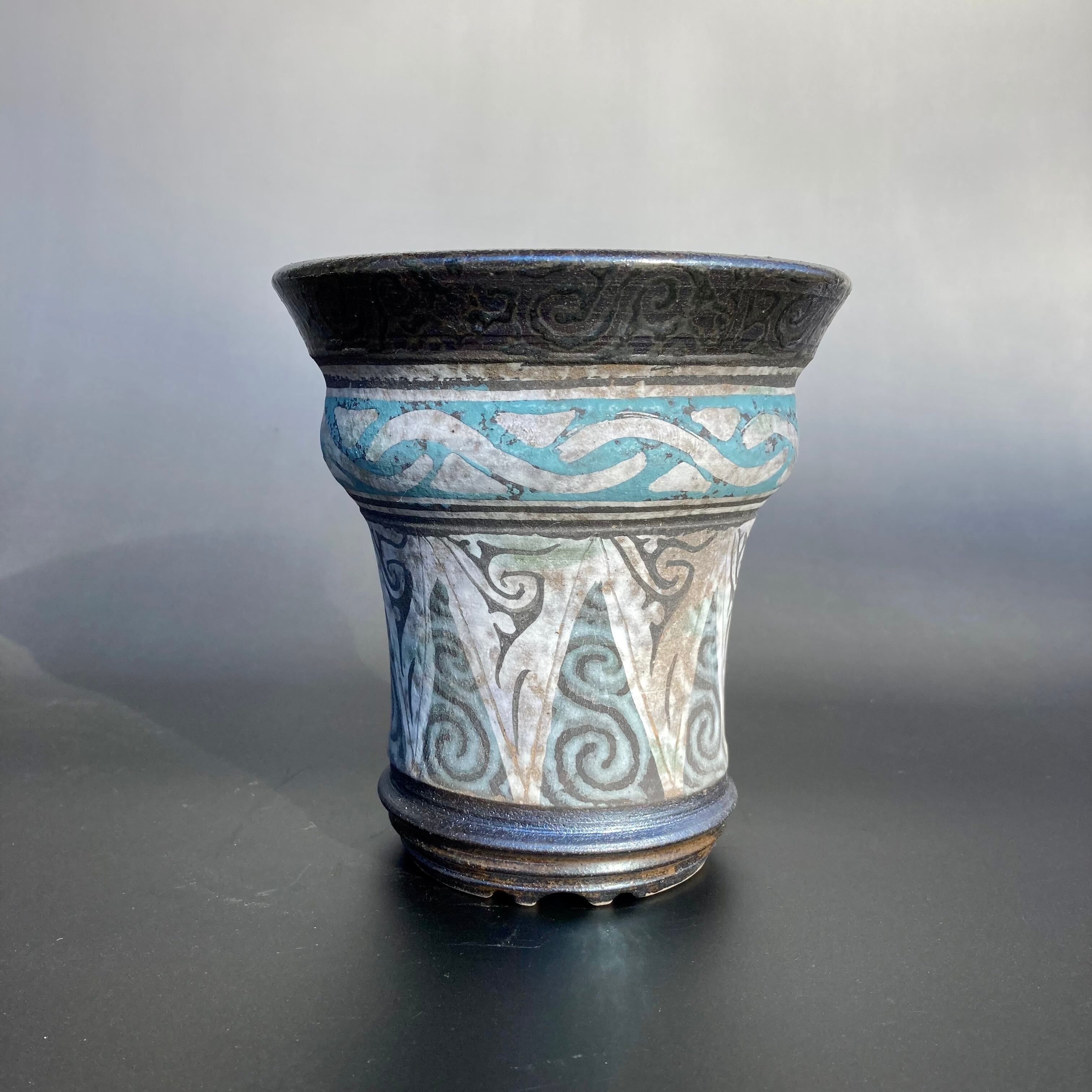 color slipによる彩色は、薪による炭彩が加わり派手でありながら渋さのある遺跡から発掘された彩色土器の風合いを帯びるよう願っています。