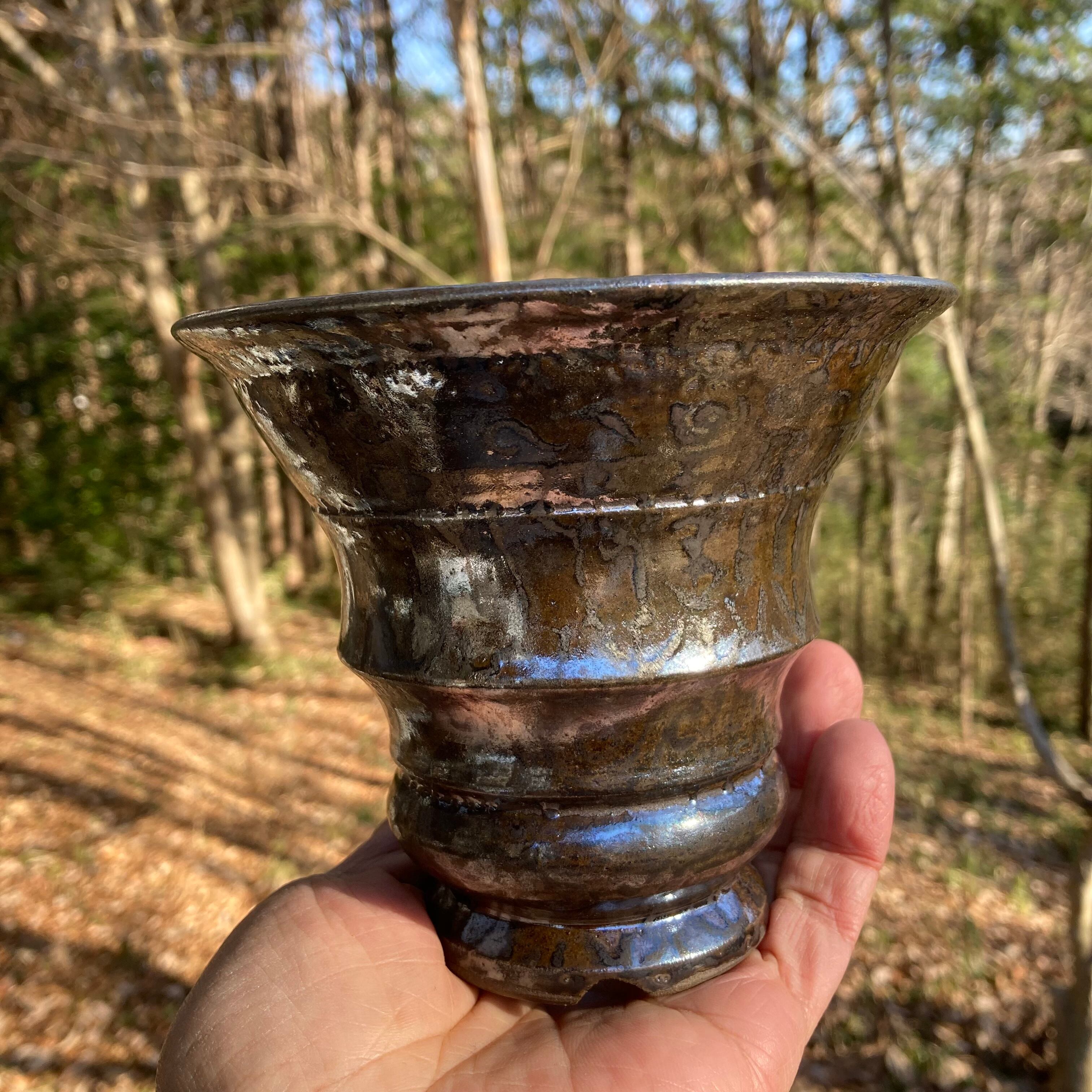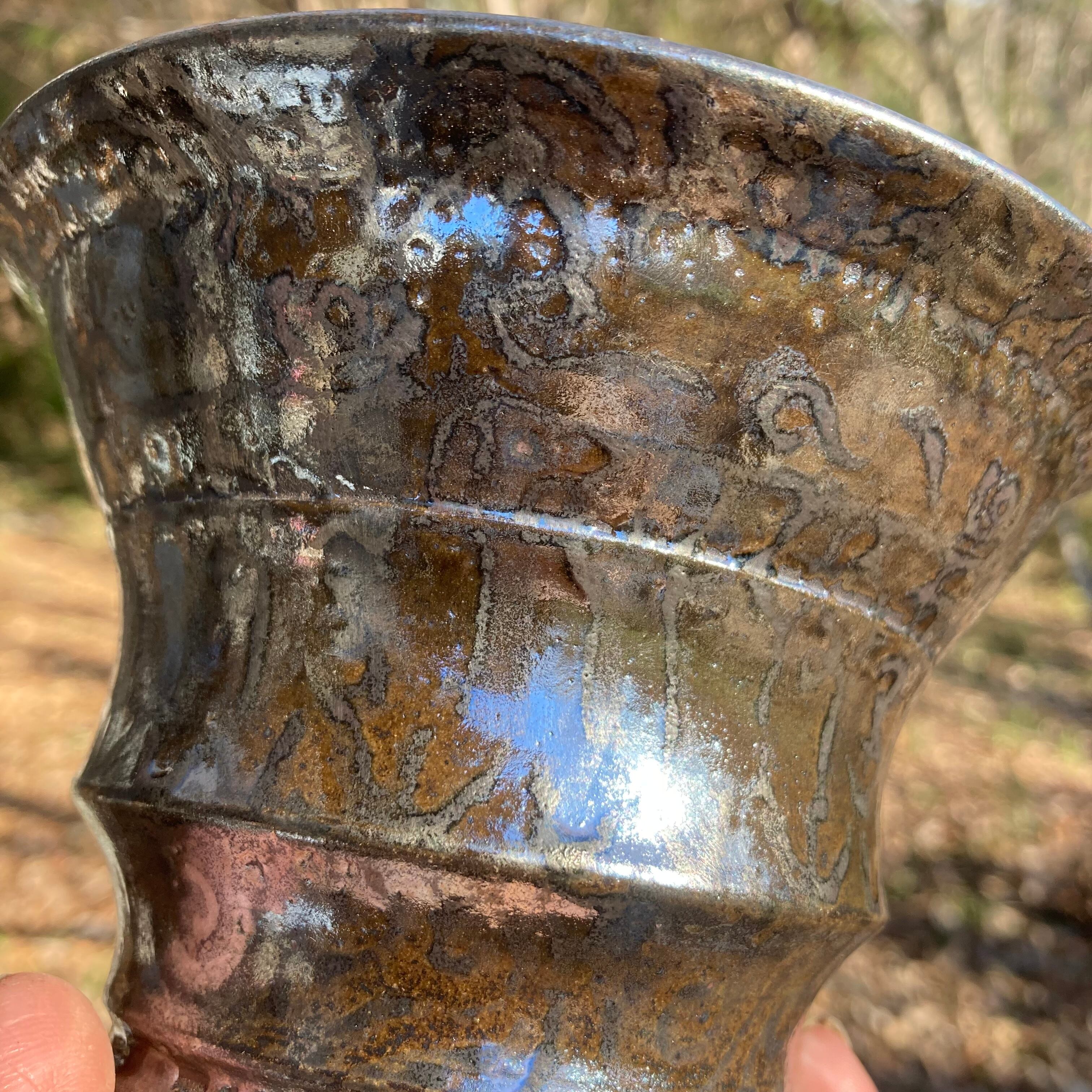 ラスター系の金属光沢で、窯野の中の置く位置で