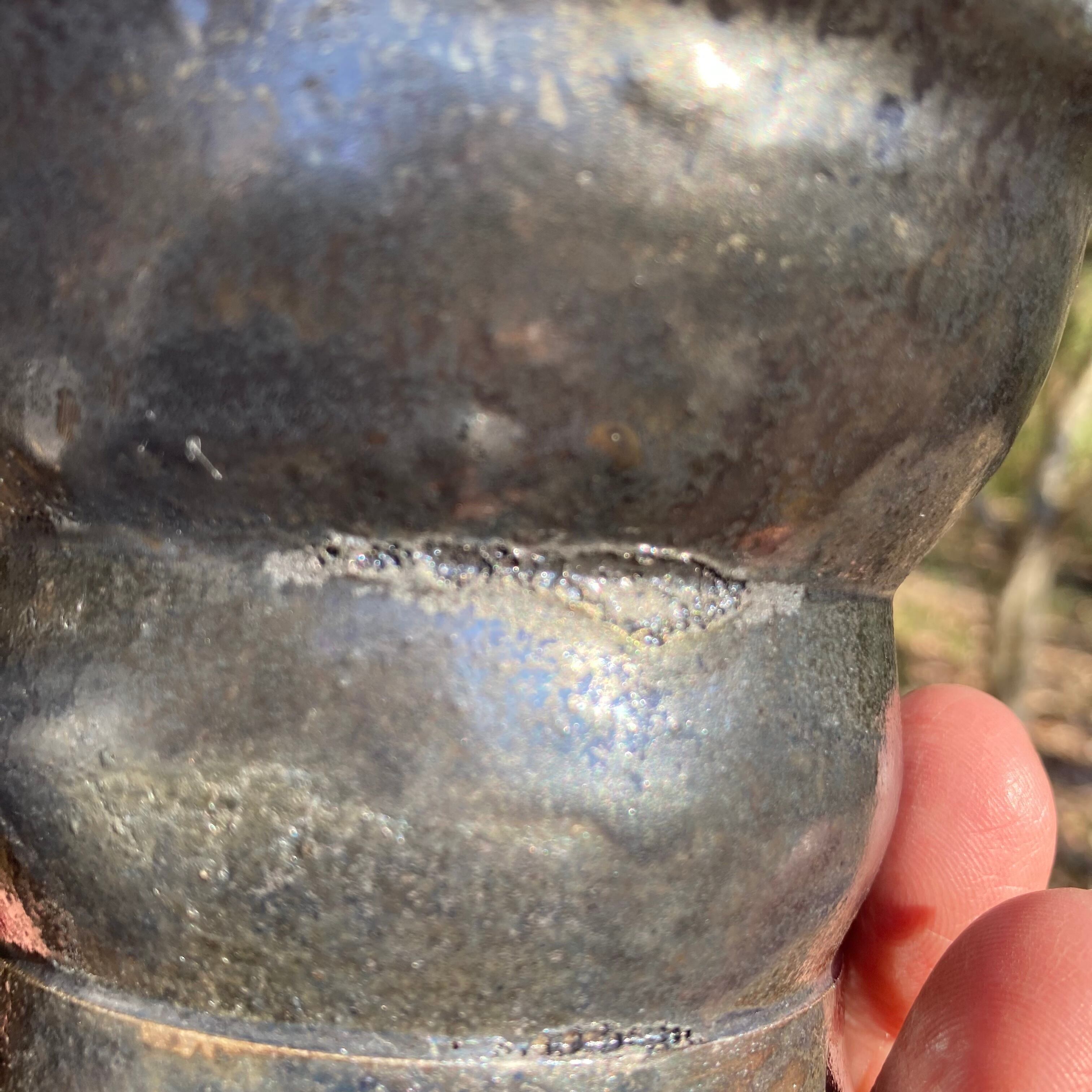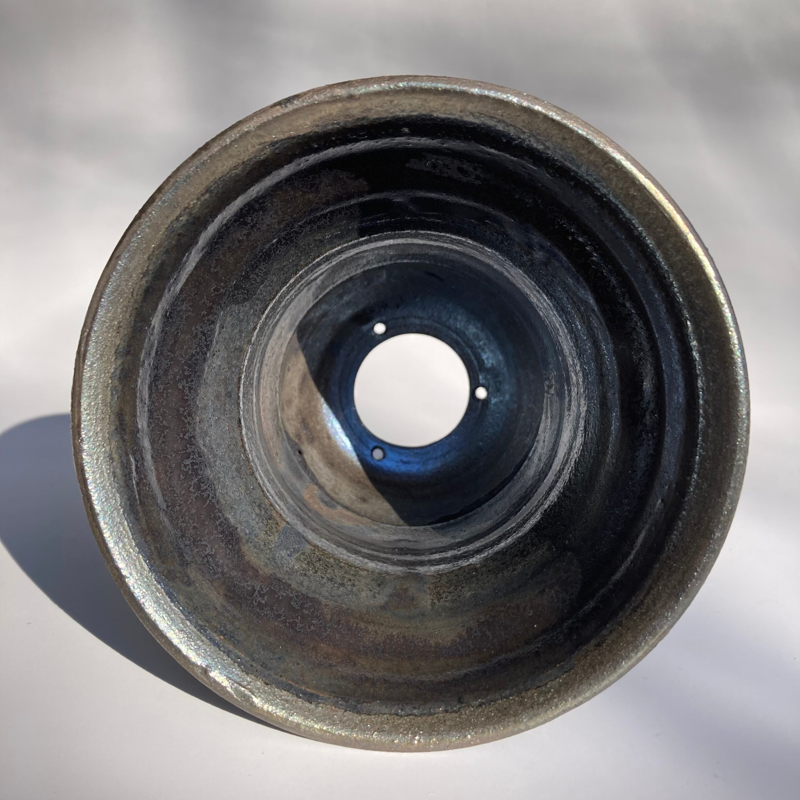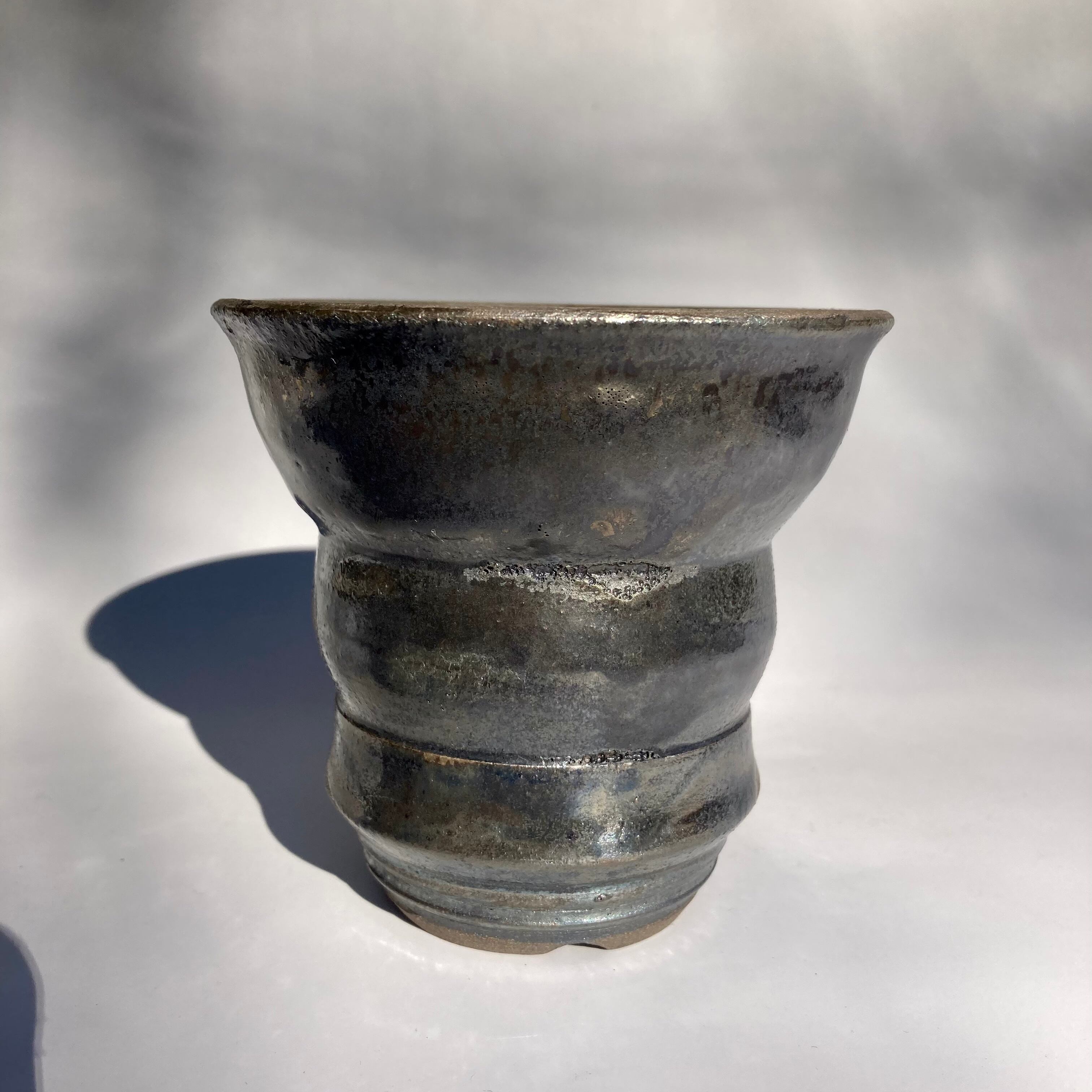 オリジナル配合の砂金釉薬(アヴェチェリン釉薬)を施しています。いわゆる金泥系の釉薬ですが、高温で焼成することにより、金属光沢にガラス質の艶が加わり耐久性のある輝きになります。時に器肌にクレータ状の釉の荒れが現れて面白い風景が生じます。光にかざすと艶のある黒銀と金色が混ざり合う複雑な表情を見ることができます。