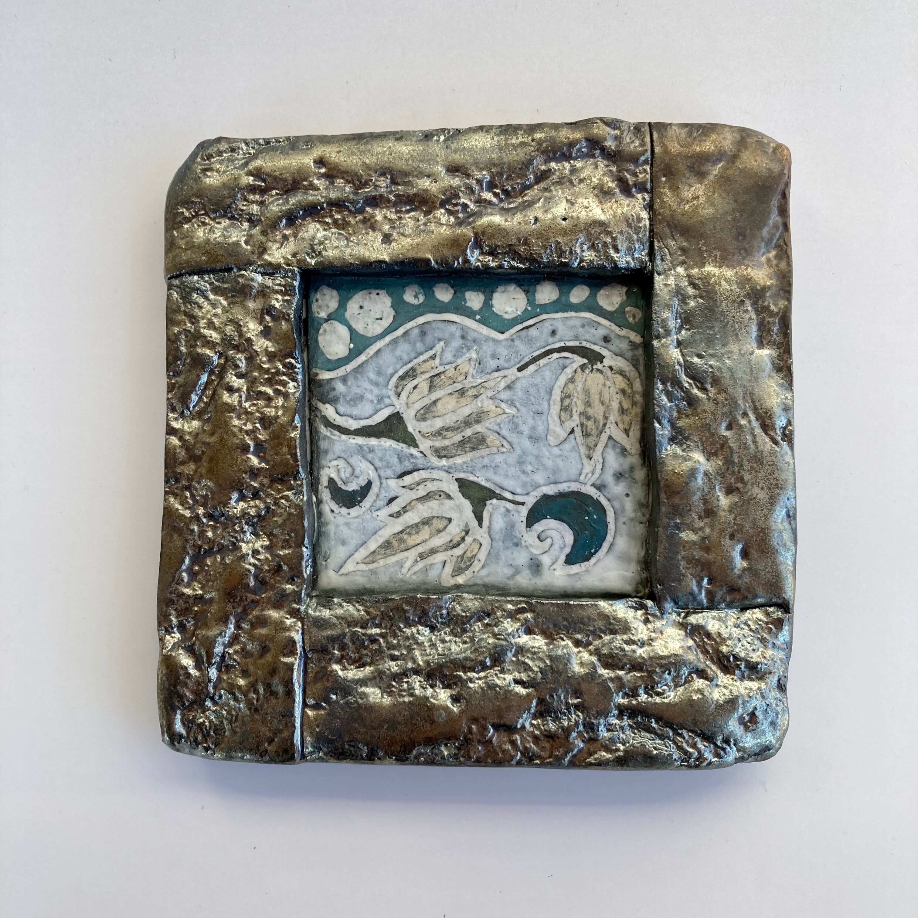 額も陶器で絵の部分と一体です。小さな陶画で壁面の少しの空きスペースに飾れます。
