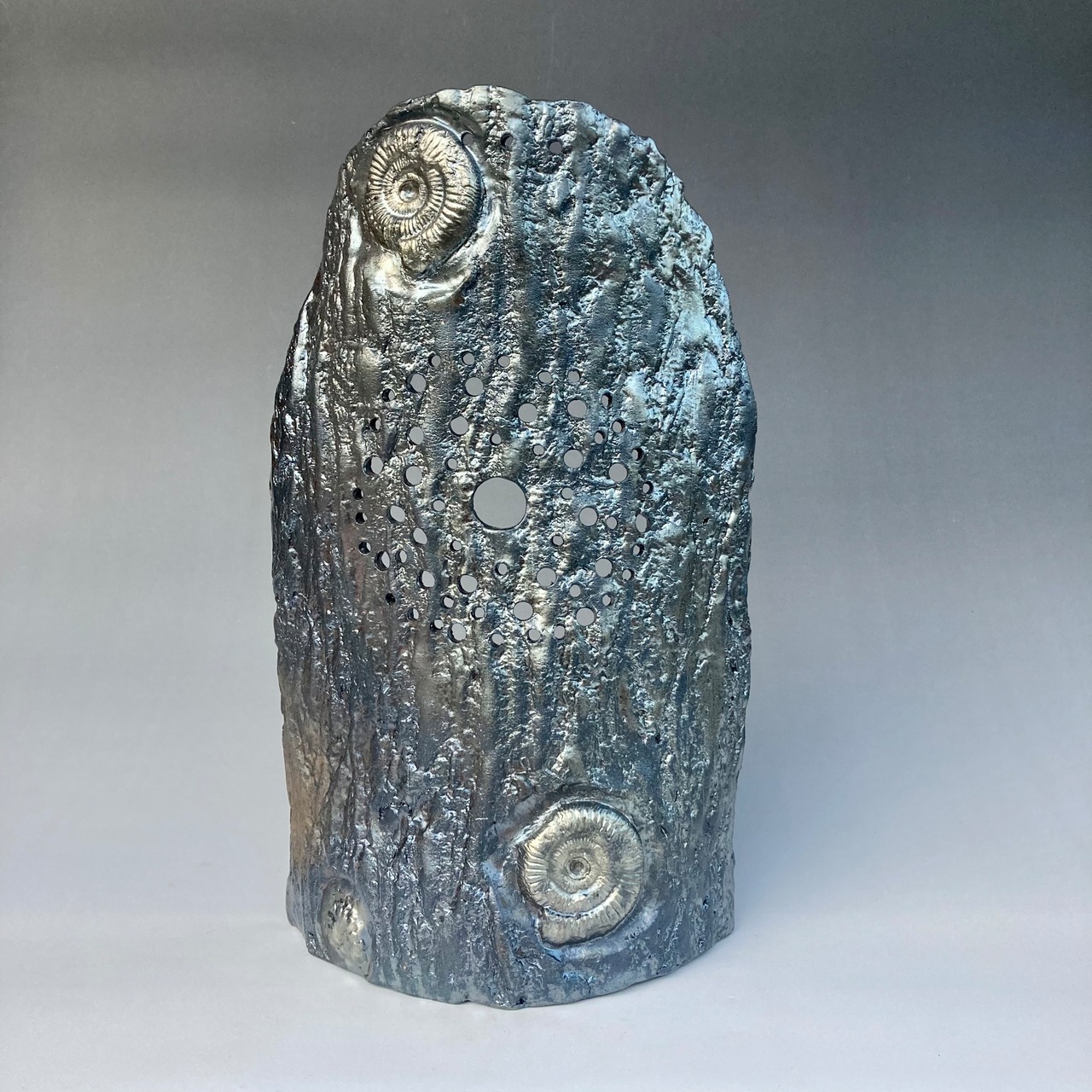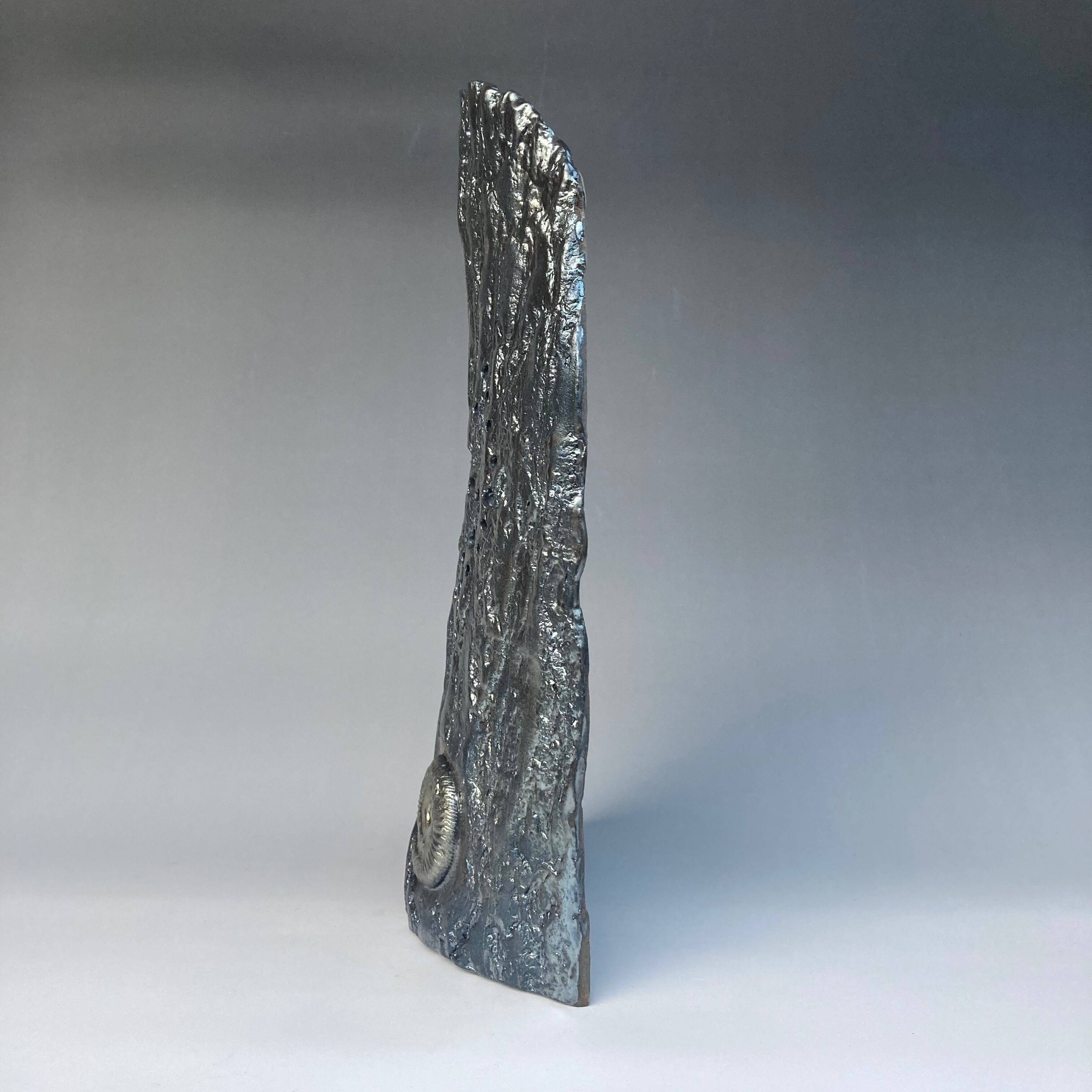 ラスター系の金属光沢が特徴的な作品です。仕上げの薪による強還元焼成で得られる金属光沢は、窯の中の置く位置で微妙に光沢が違います。時に黒銀から金色にグラデーションする変化のある渋い輝きを得ることができます。