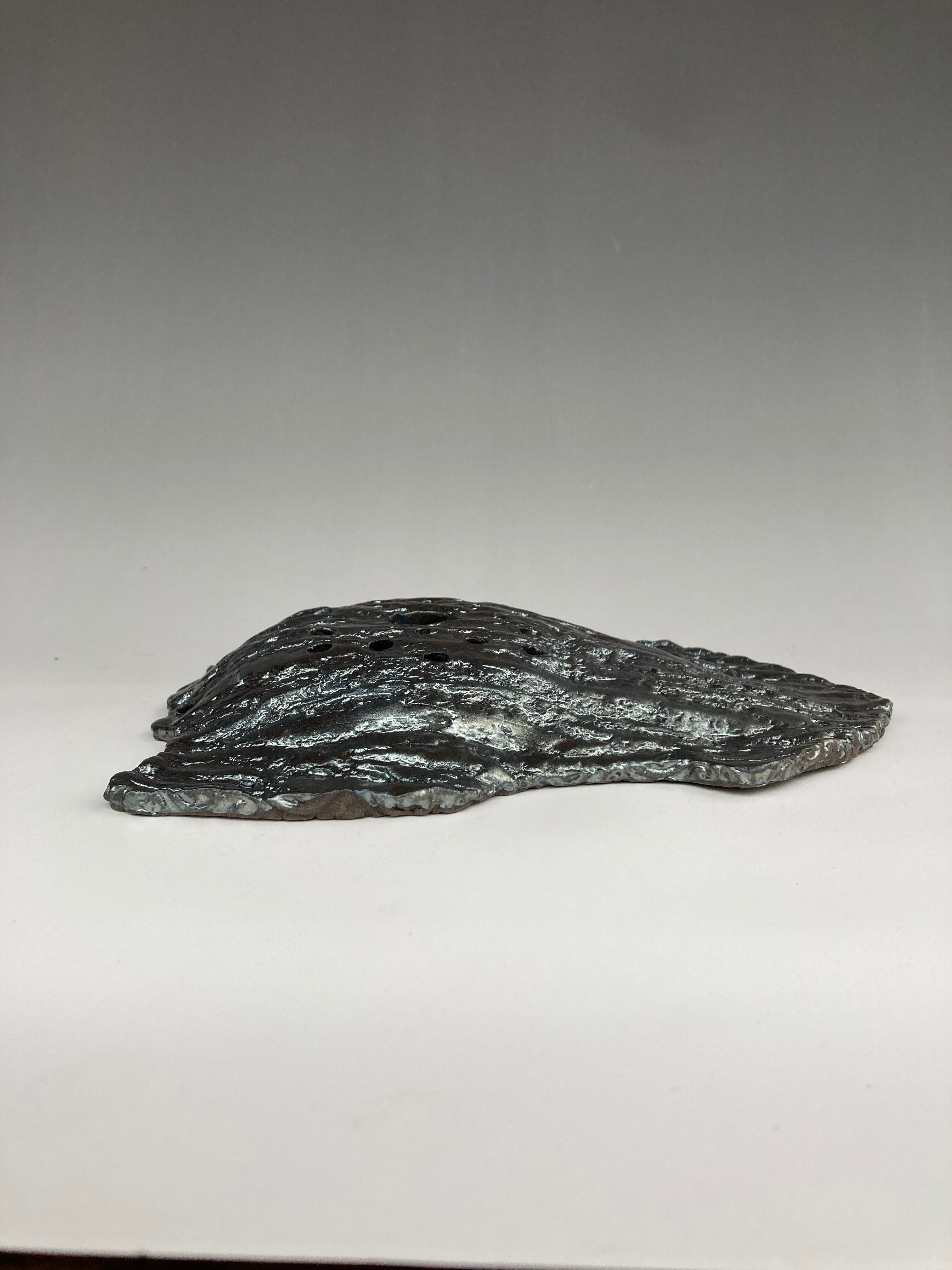 ラスター系の金属光沢が特徴的な作品です。仕上げの薪による強還元焼成で得られる金属光沢は、窯の中の置く位置で微妙に光沢が違います。時に黒銀から金色にグラデーションする変化のある渋い輝きを得ることができます。