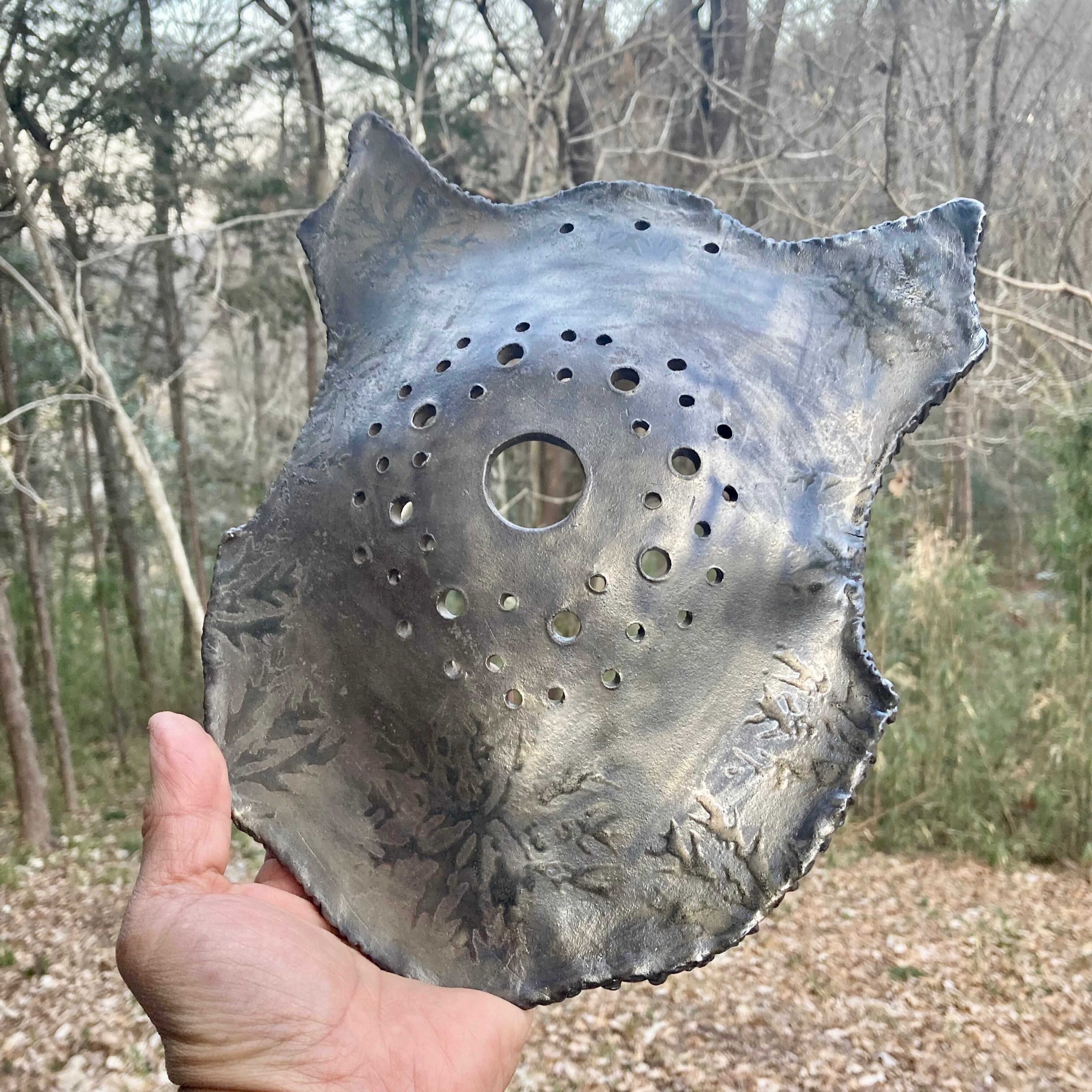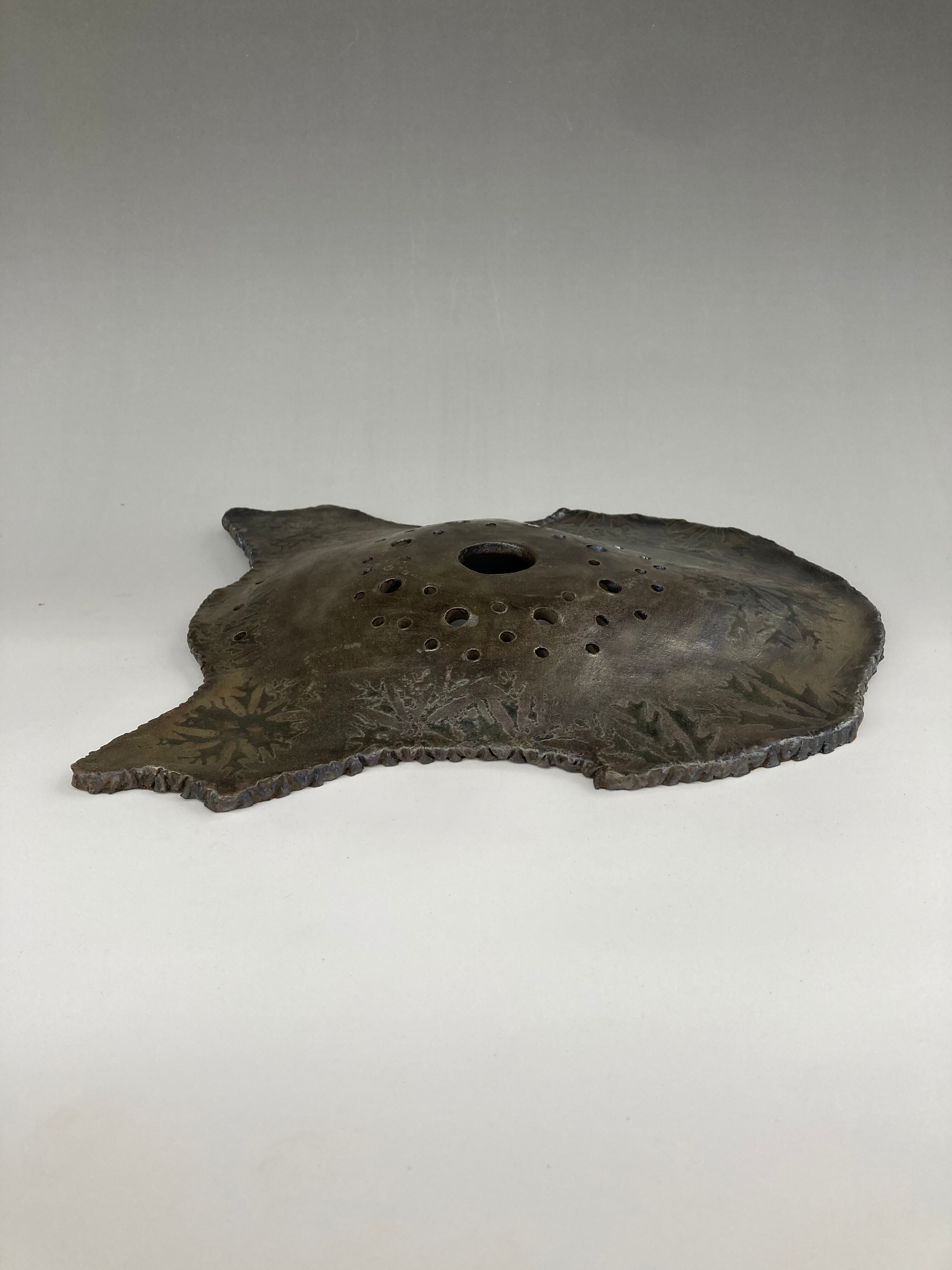 陶器で作ったビカクシダ(コウモリラン)の着生盤です。本体にふくらみを持たせて通気性を確保しました。貯水葉が全面を覆い前から水やりがやり難い場合でも、着生板裏から中央の穴を使い水やりが出来るように成形しました。