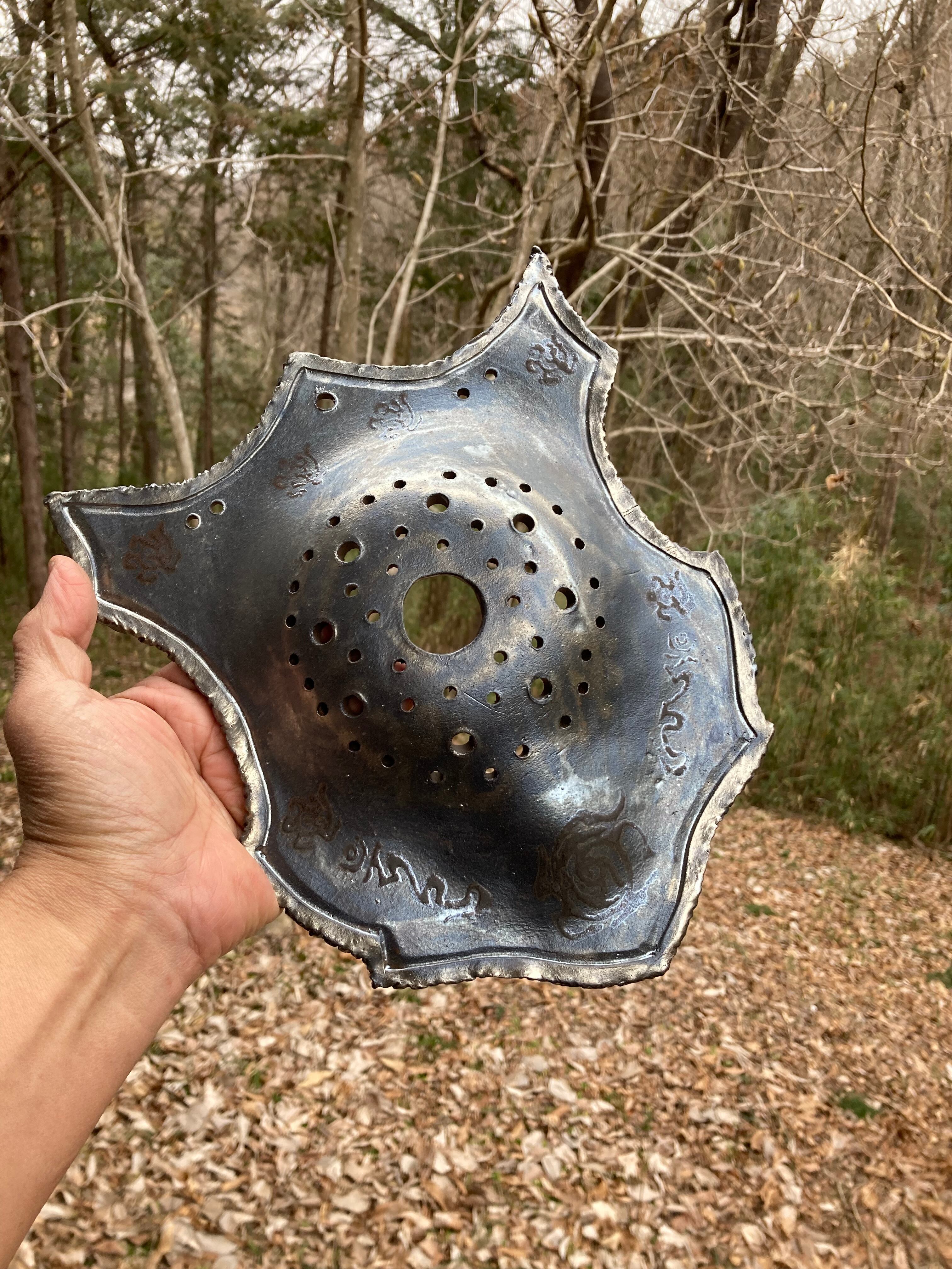 陶器で作ったビカクシダ(コウモリラン)の着生盤です。本体にふくらみを持たせて通気性を確保しました。貯水葉が全面を覆い前から水やりがやり難い場合でも、着生板裏から中央の穴を使い水やりが出来るように成形しました。