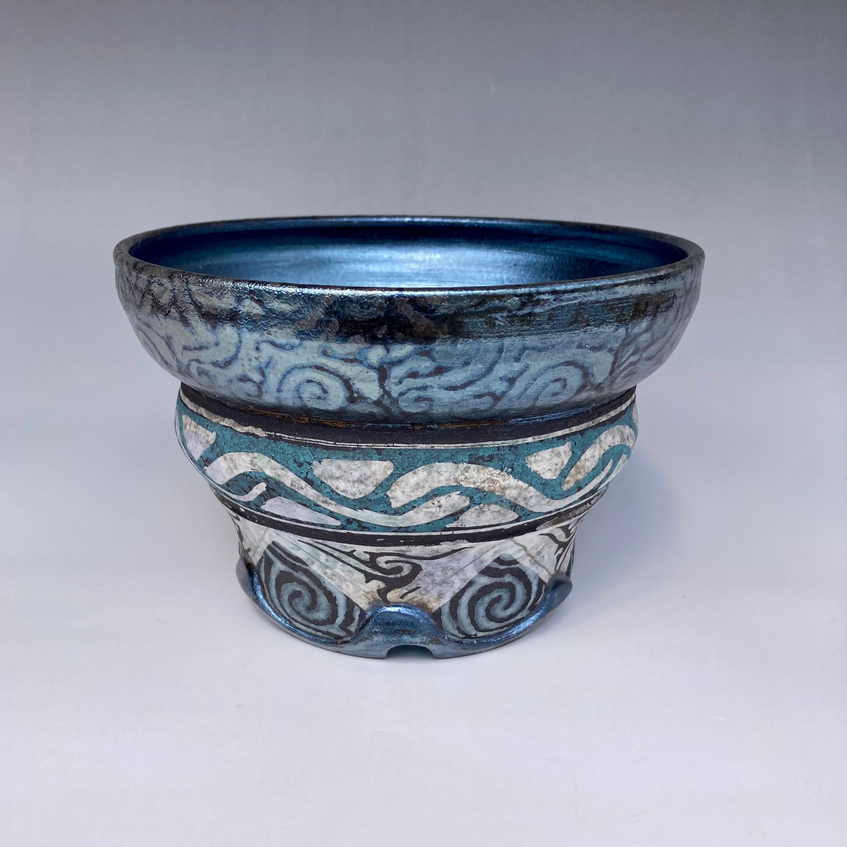 鋸歯文様、いわゆる鋭角のギザギザ模様は古代の土器にも使われる文様です。これを基に筆書き、線彫り、印押し、蝋結などの技法を使いオリジナルに展開したデザインです。