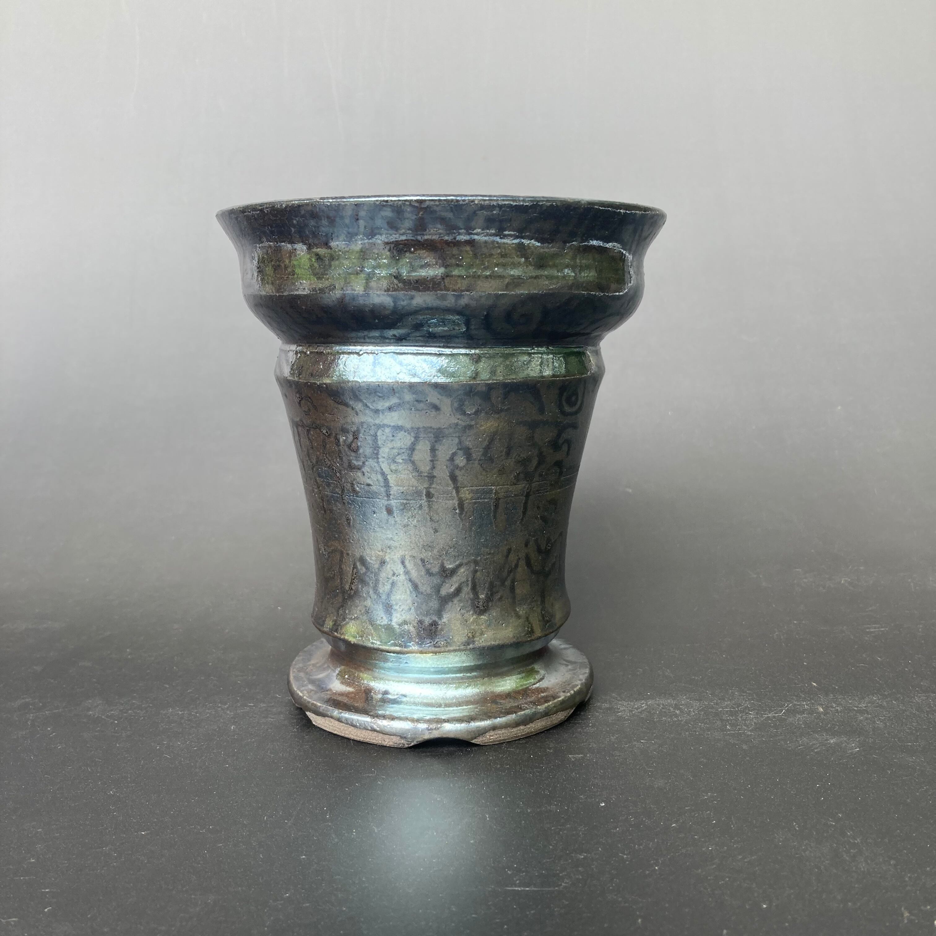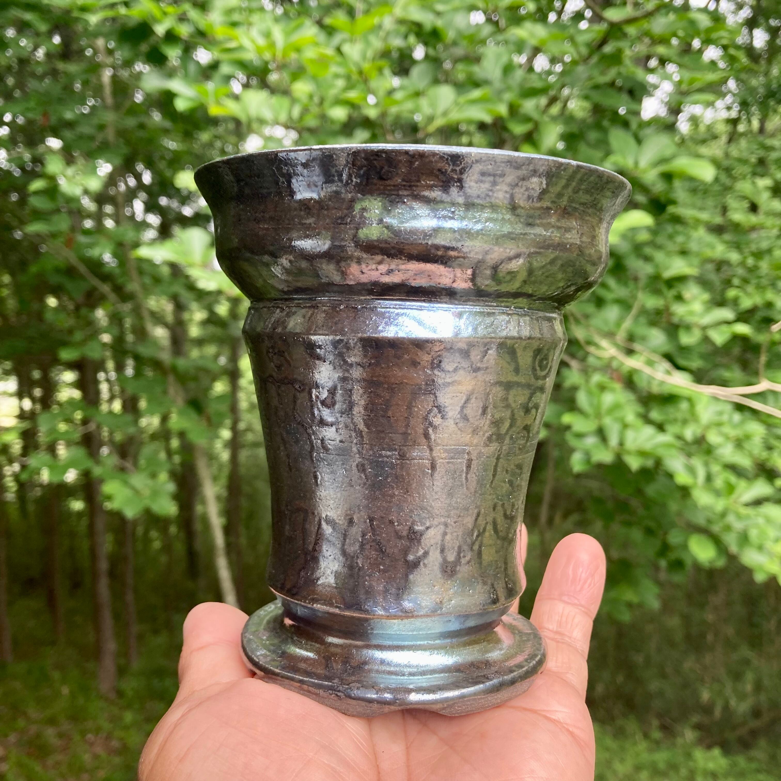 器肌全体に施された渋い光沢は、仕上げの薪による強還元焼成で得られるラスター系の金属光沢です。窯野の中の置く位置で微妙に黒銀、黒金光沢などの発色が異なる特徴があります。