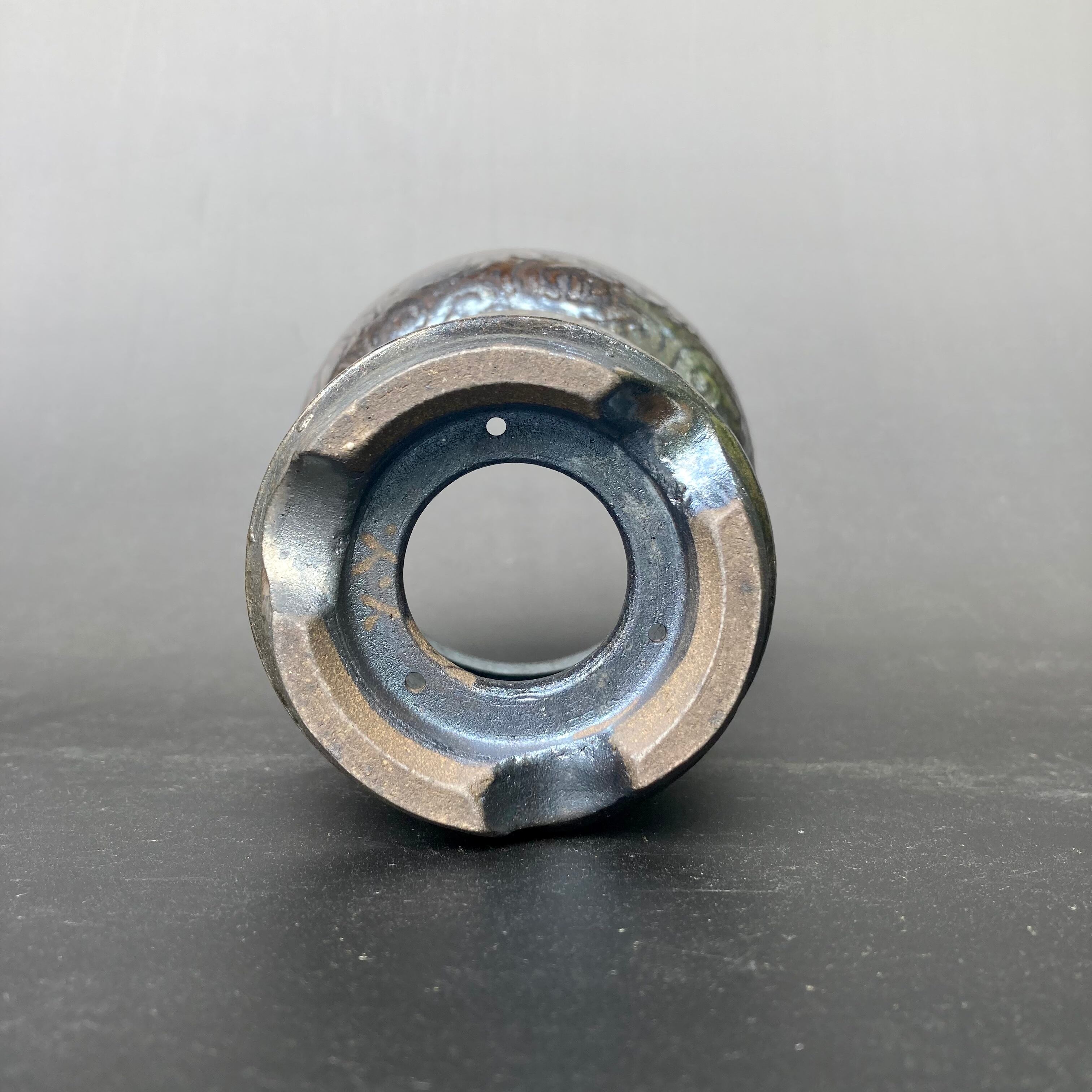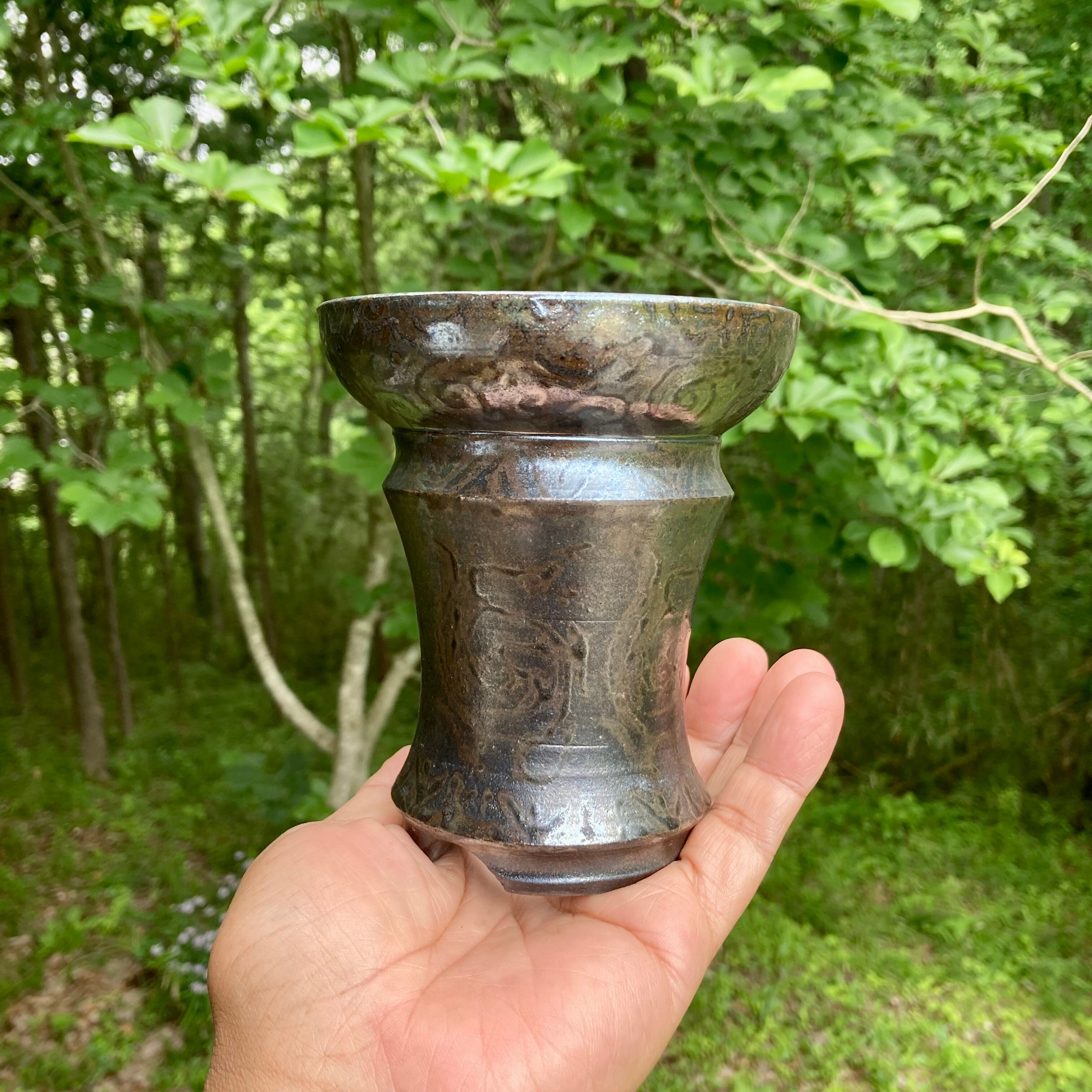 器肌全体に施された渋い光沢は、仕上げの薪による強還元焼成で得られるラスター系の金属光沢です。窯野の中の置く位置で微妙に黒銀、黒金光沢などの発色が異なる特徴があります。