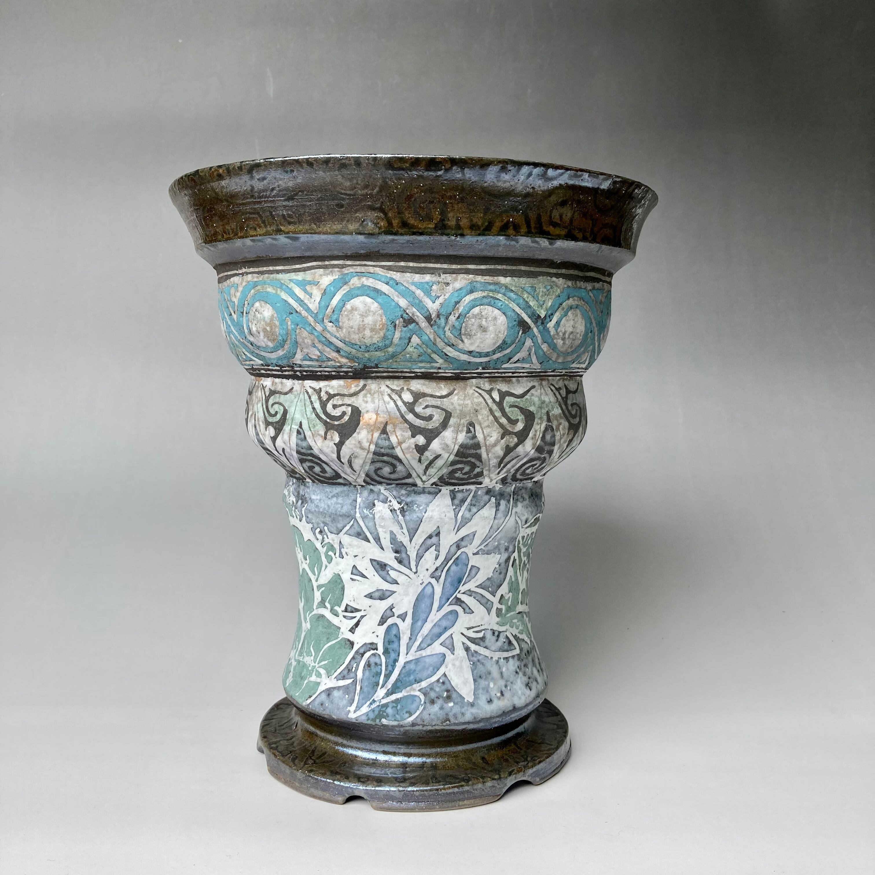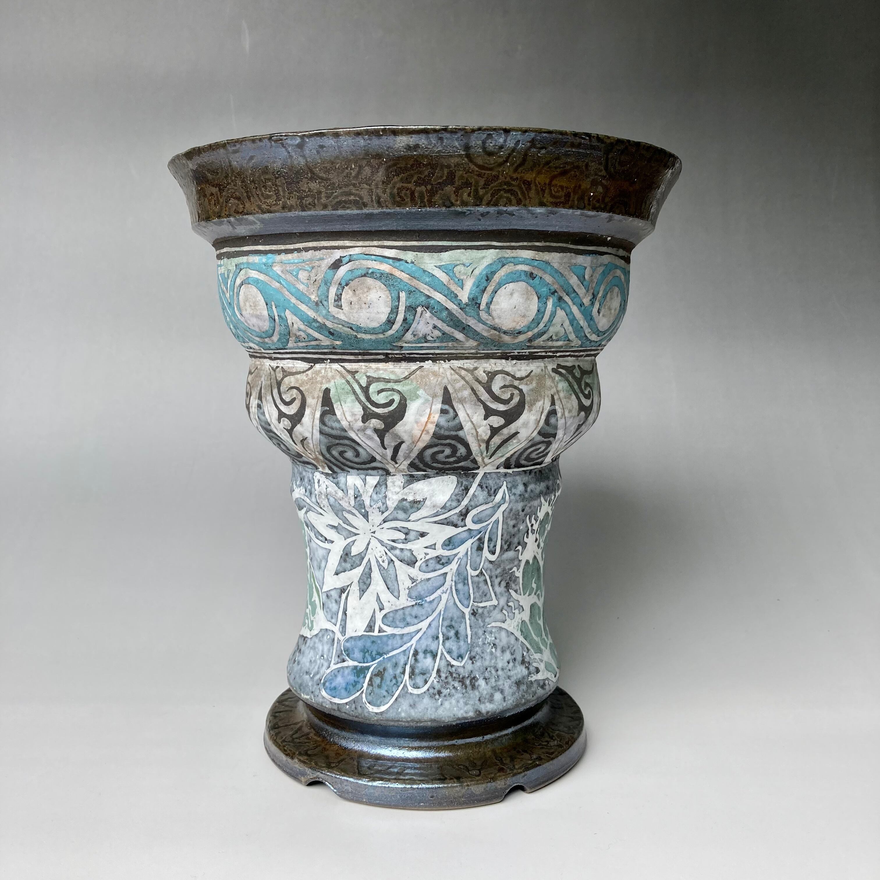 器肌上部には、流水をデザイン化した文様をその下には鋸歯をデザイン化した文様、胴部分にはチタノタ系アガベ文様と花弁と連葉をデザイン化した模様を描いています。