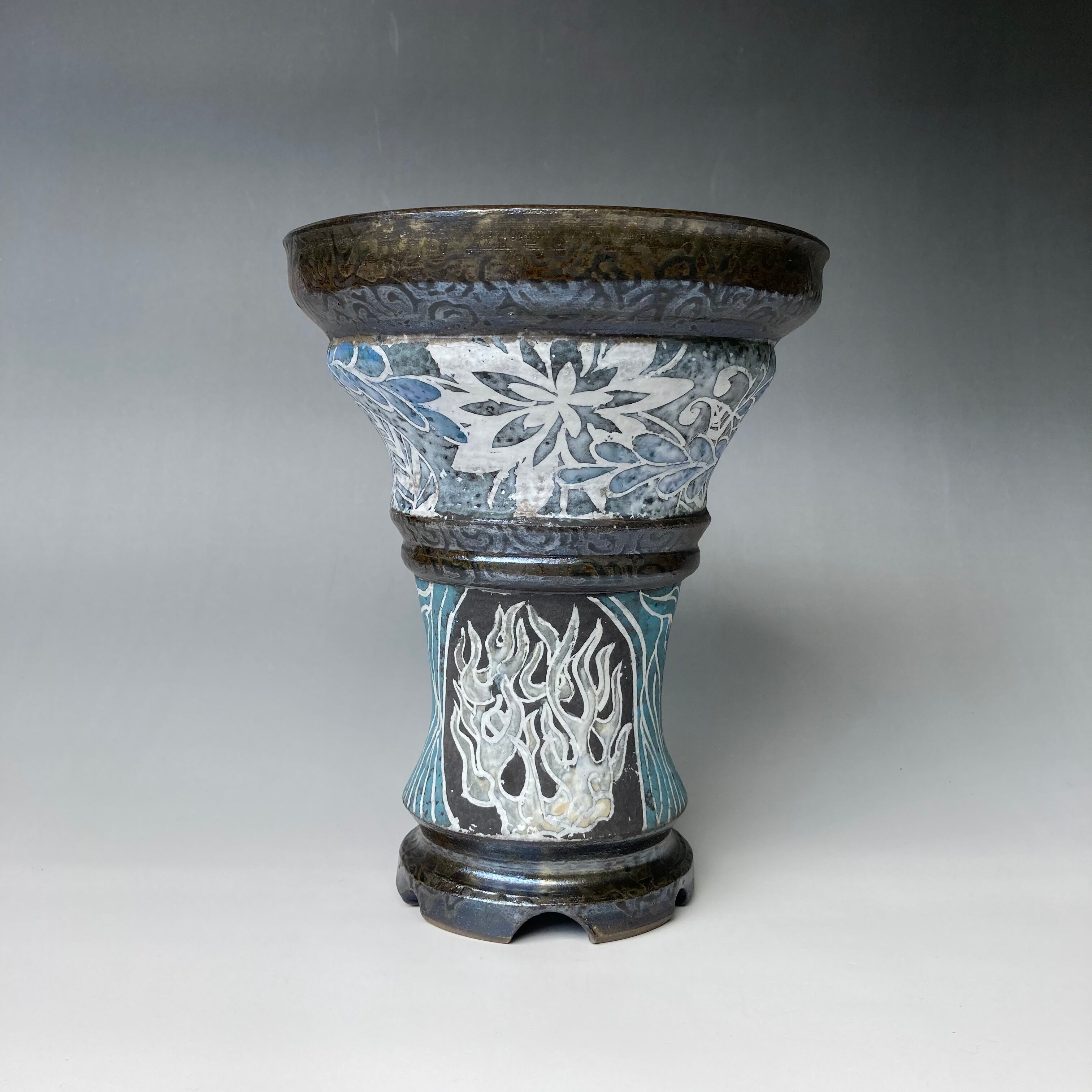 胴部分に黒炎、白炎をモチーフに模様を描いています。上部は、植物をデザイン化した模様を描きました。