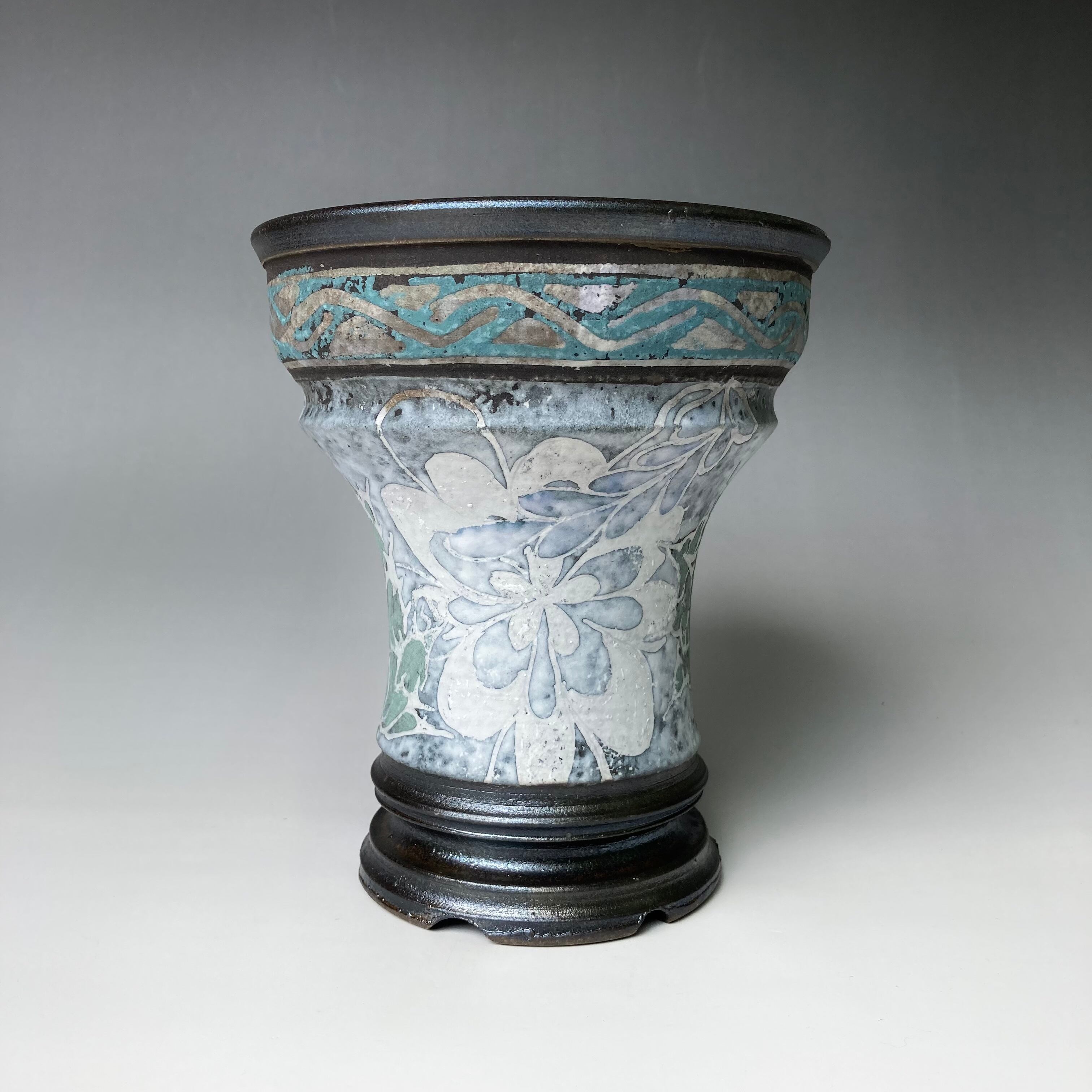器肌上部には、流水をデザイン化した文様をその下には鋸歯をデザイン化した文様、胴部分にはチタノタ系アガベ文様と花弁と連葉をデザイン化した模様を描いています。