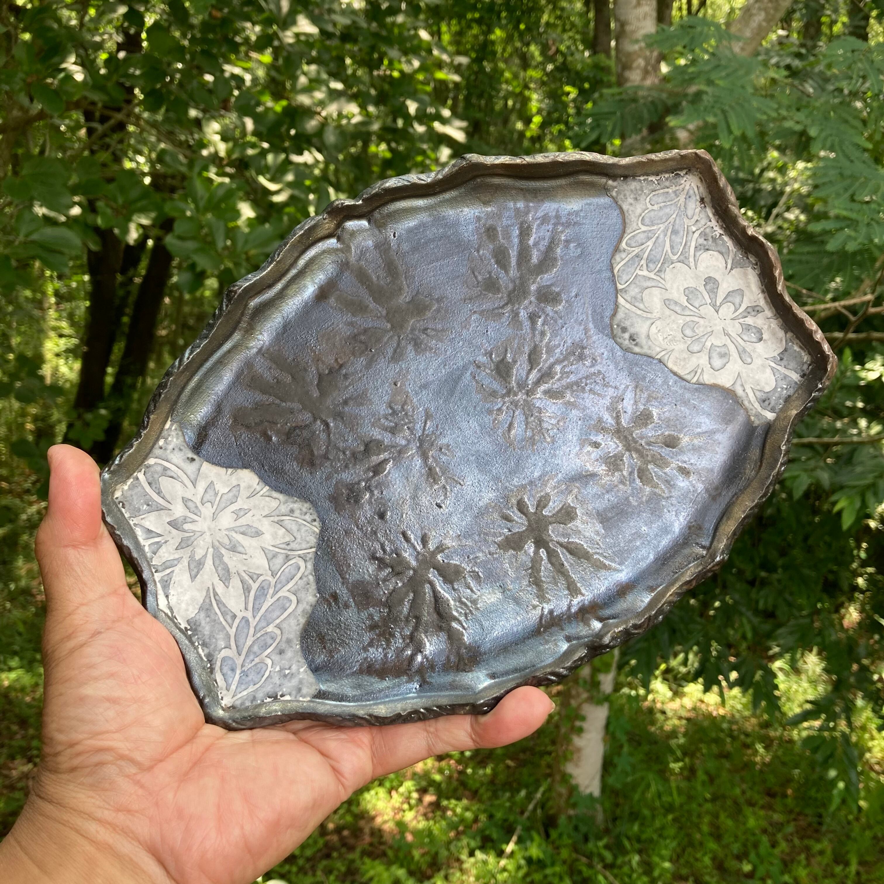 内側の釉薬は、薪による強還元で得られる燻し銀黒で野菜のグリーンやトマトの赤が映え美味しく見えると思います。