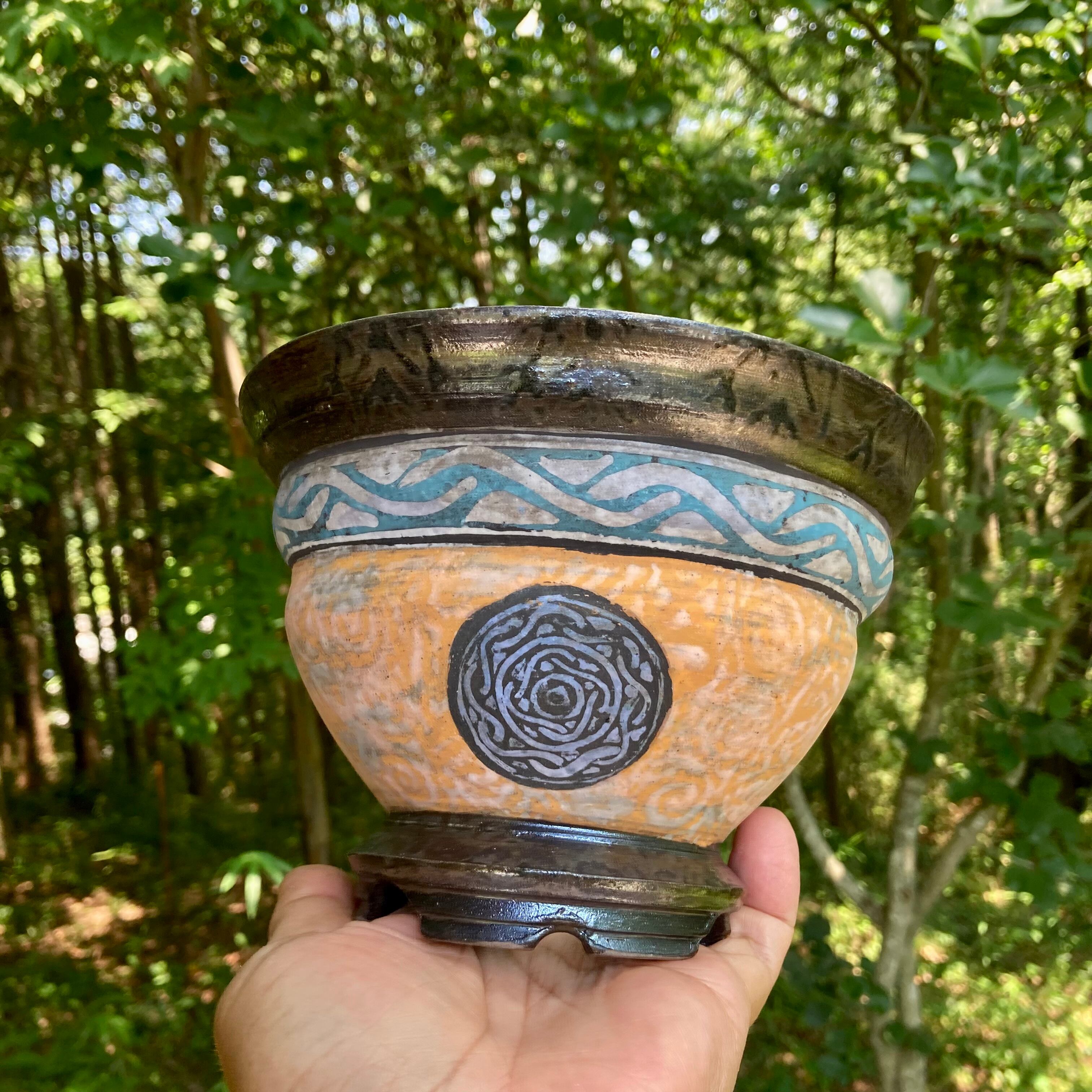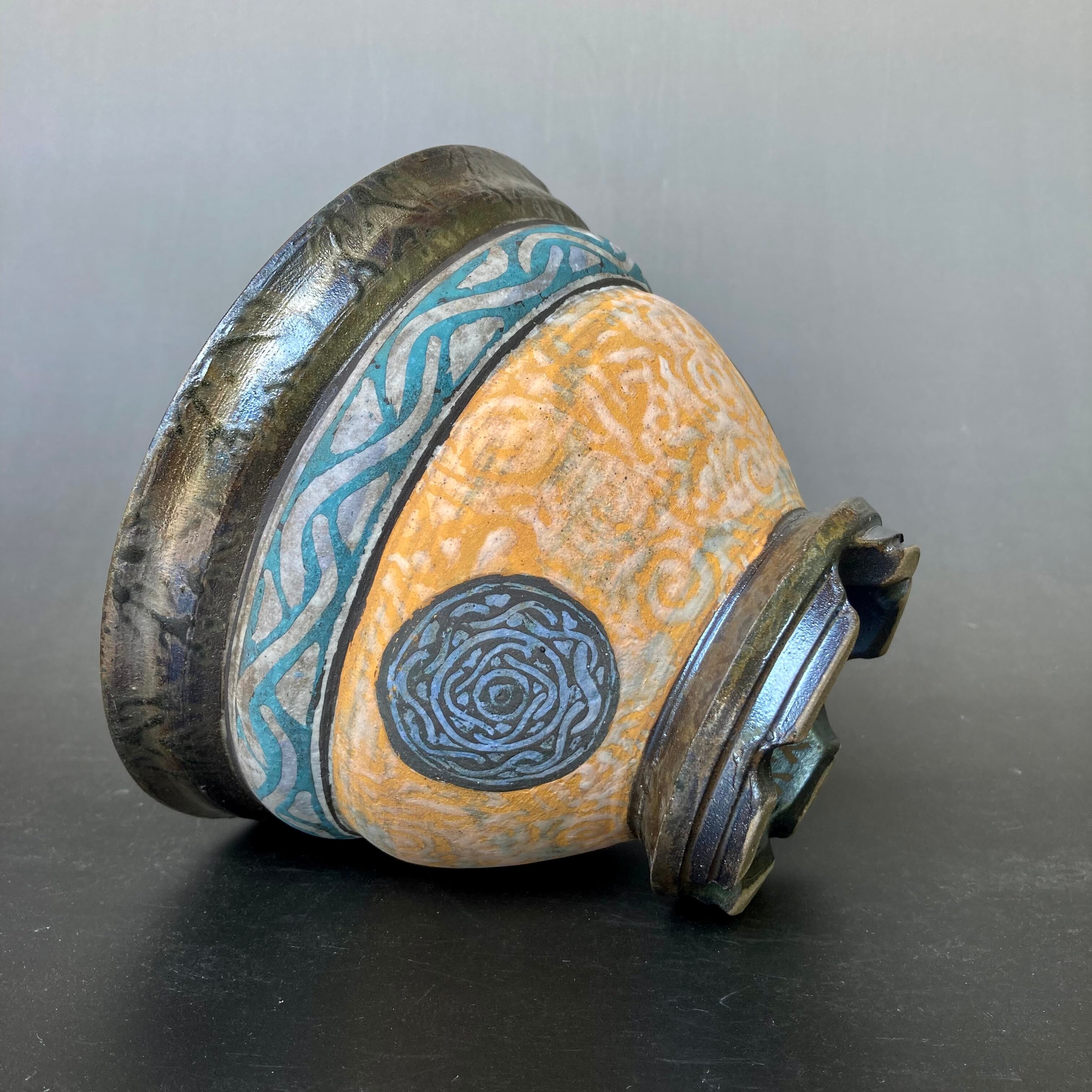 color slipによる彩色は、薪による炭彩が加わり派手でありながら渋い発色の仕上がりとなっています。古代の遺跡から発掘された彩色土器の様な風合いを帯びるよう志向して彩色したものです。