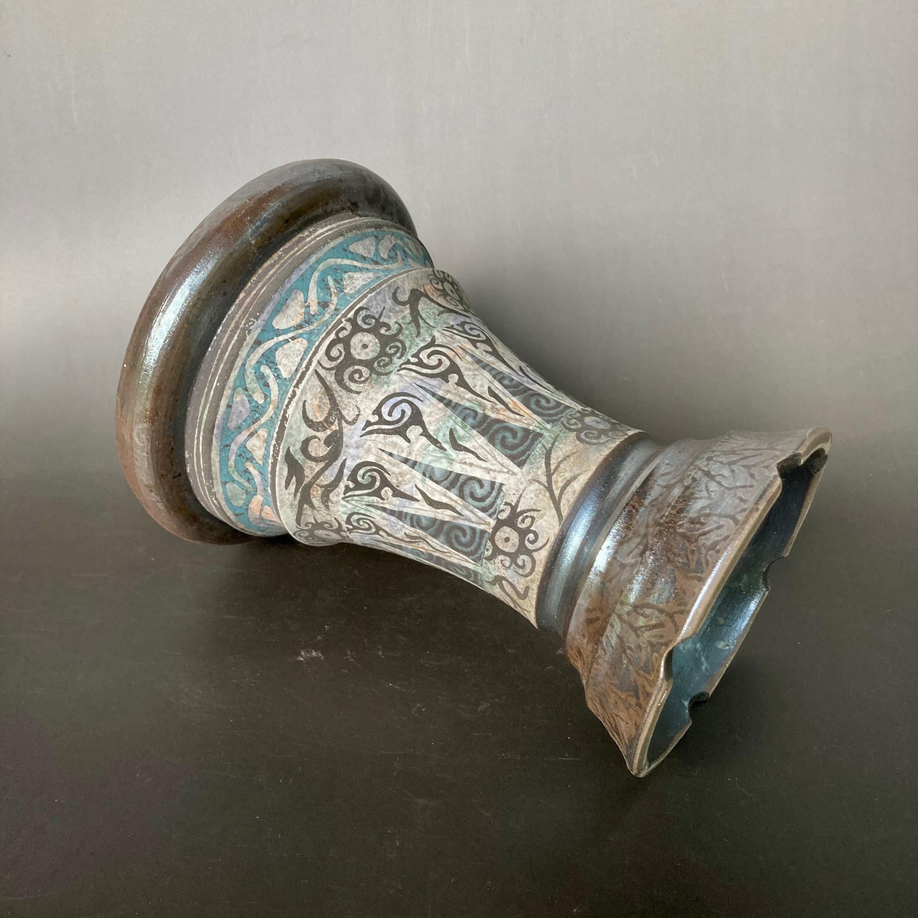 器肌上部には、流水をデザイン化した文様をその下に蔓草をデザイン化した文様、胴部分に鋸歯と渦巻く気流をデザイン化した模様を描いています。