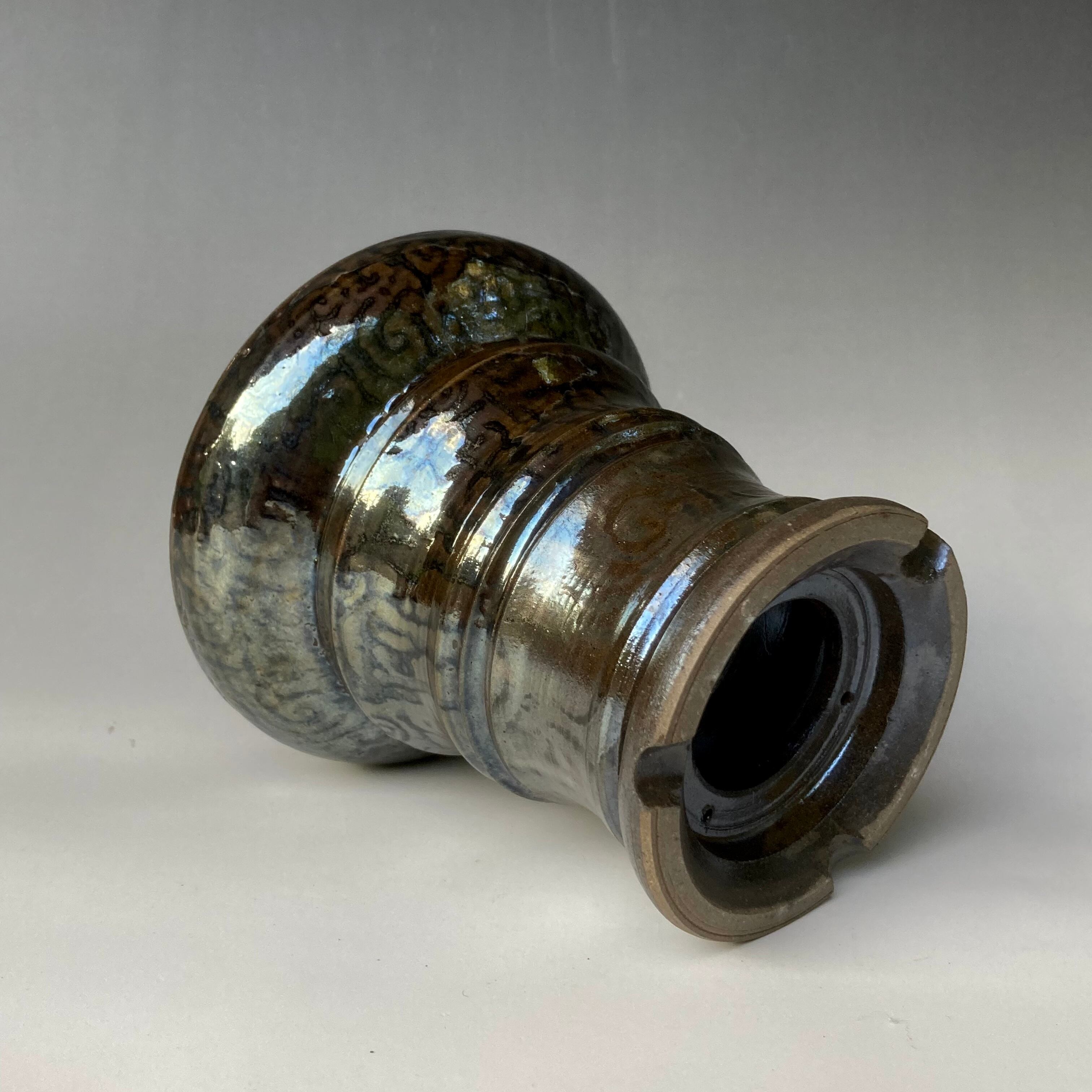 器肌全体に施された渋い光沢は、仕上げの薪による強還元焼成で得られるラスター系の金属光沢です。窯の中の置く位置で微妙に黒銀、黒金光沢などの発色が異なる特徴があります。