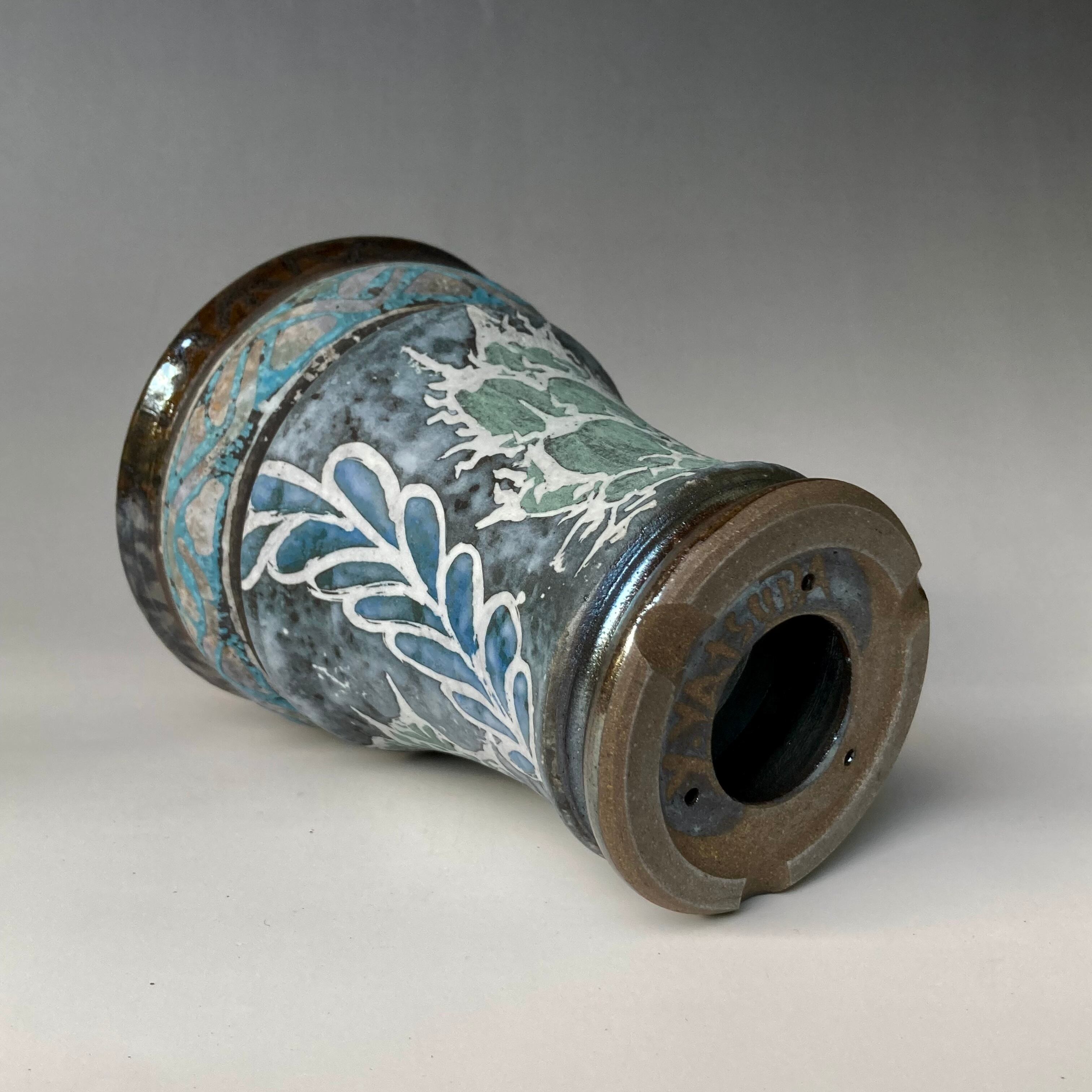 器肌上部には、胴部分にはチタノタ(オテロイ)系アガベ文様と連葉をデザイン化した模様を手描きで丁寧に描いています。