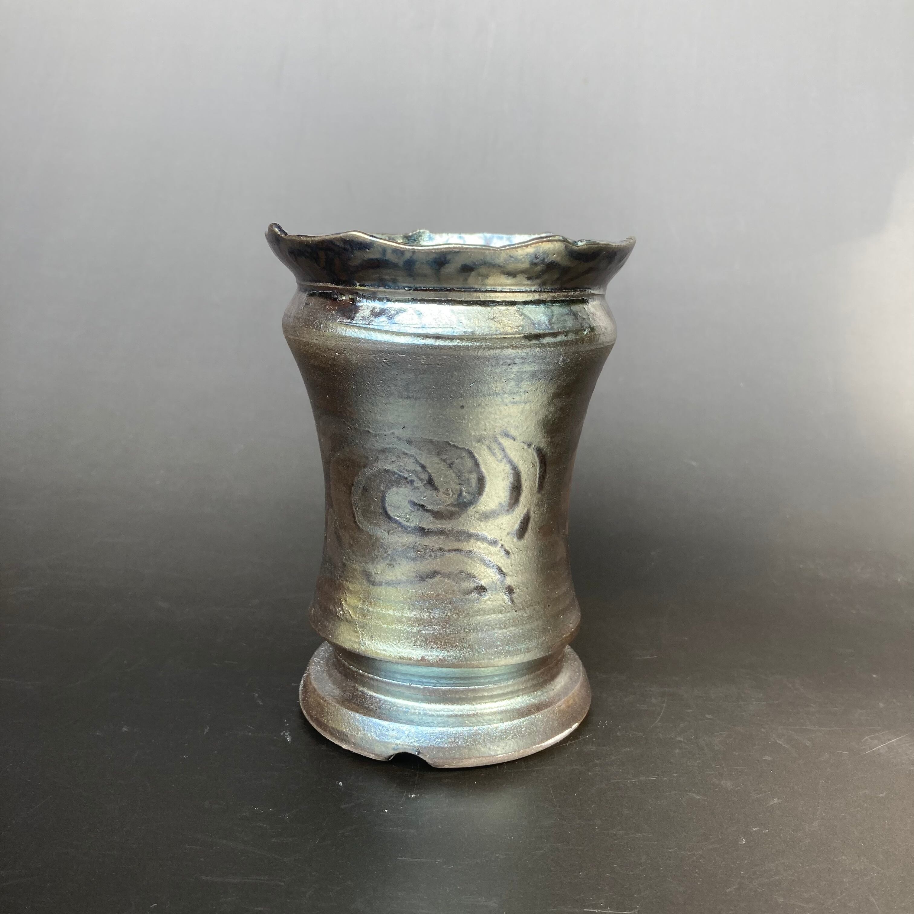 器肌全体に施された渋い光沢は、仕上げの薪による強還元焼成で得られるラスター系の金属光沢です。窯野の中の置く位置で微妙に黒銀、黒金光沢などの発色が異なる特徴があります。