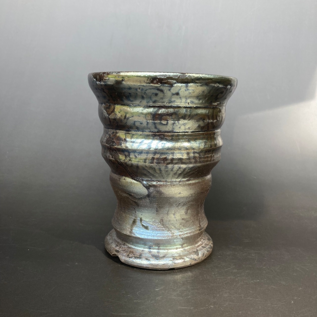 器肌全体に施された渋い光沢は、仕上げの薪による強還元焼成で得られるラスター系の金属光沢です。窯の中の置く位置で微妙に黒銀、黒金光沢などの発色が異なる特徴があります。